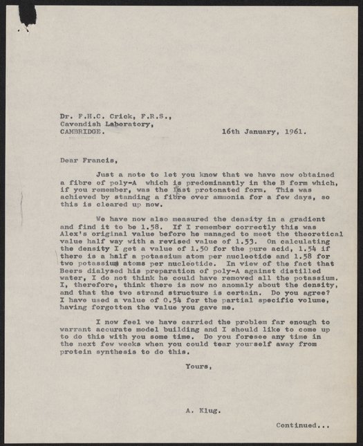 Klug, A. (Aaron), Sir. “Letter from Aaron Klug to Francis Crick, January 16, 1961,” January 16, 1961. History of Molecular Biology Collection, Box 19, Folder 20. Science History Institute. Philadelphia. https://digital.sciencehistory.org/works/24cwlh0.