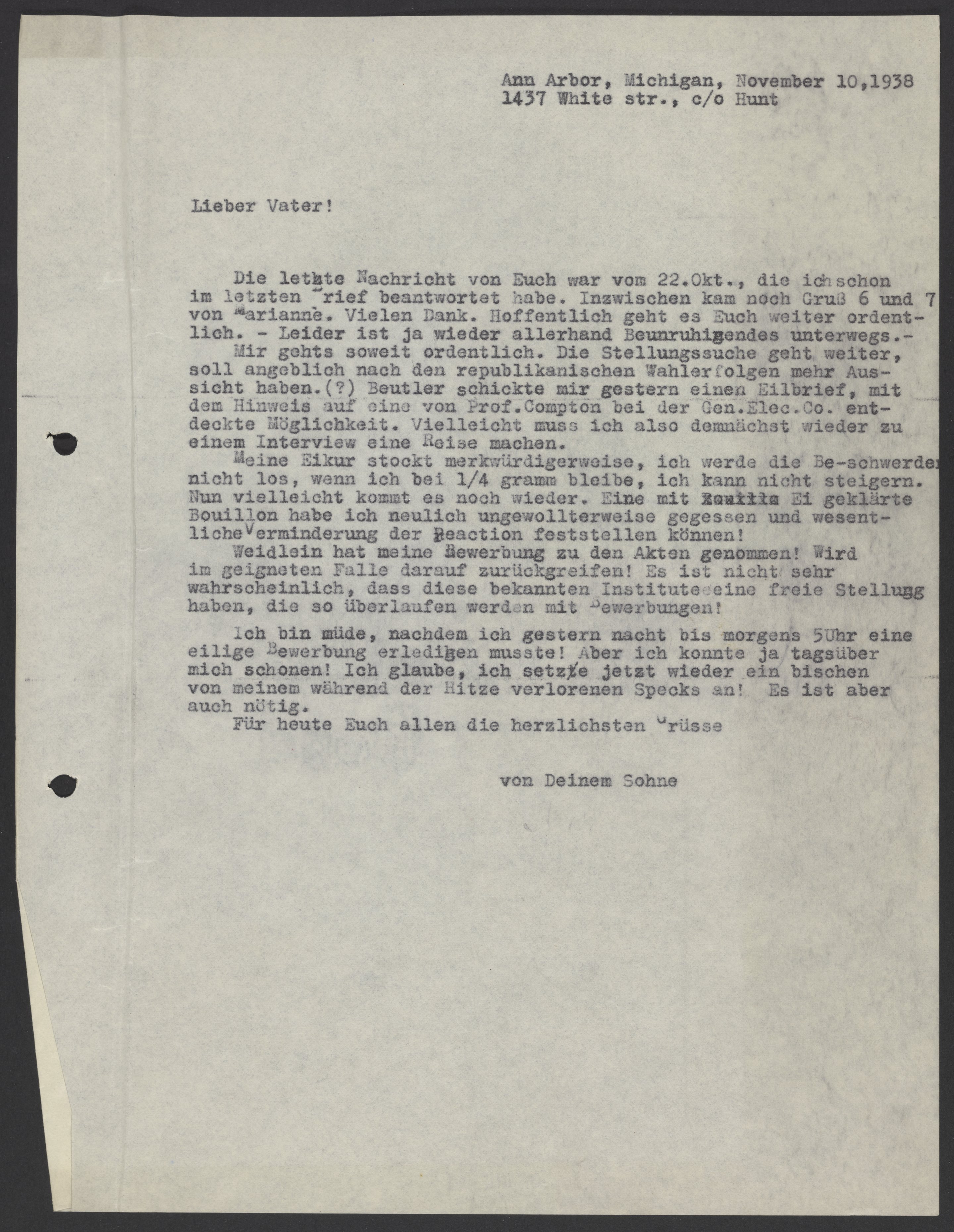Mir gehts soweit ordentlich. Die Stellungssuche geht weiter, soll angeblich nach den republikanischen Wahlerfolgen mehr Aussicht haben. (?) Beutler schickte mir gestern einen Eilbrief mit dem Hinweis auf eine von Prof. Compton bei den Gen. Elec. Co entdeckte Möglichkeit. Vielleicht muss ich also demnächst wieder zu einem Interview eine Reise machen.