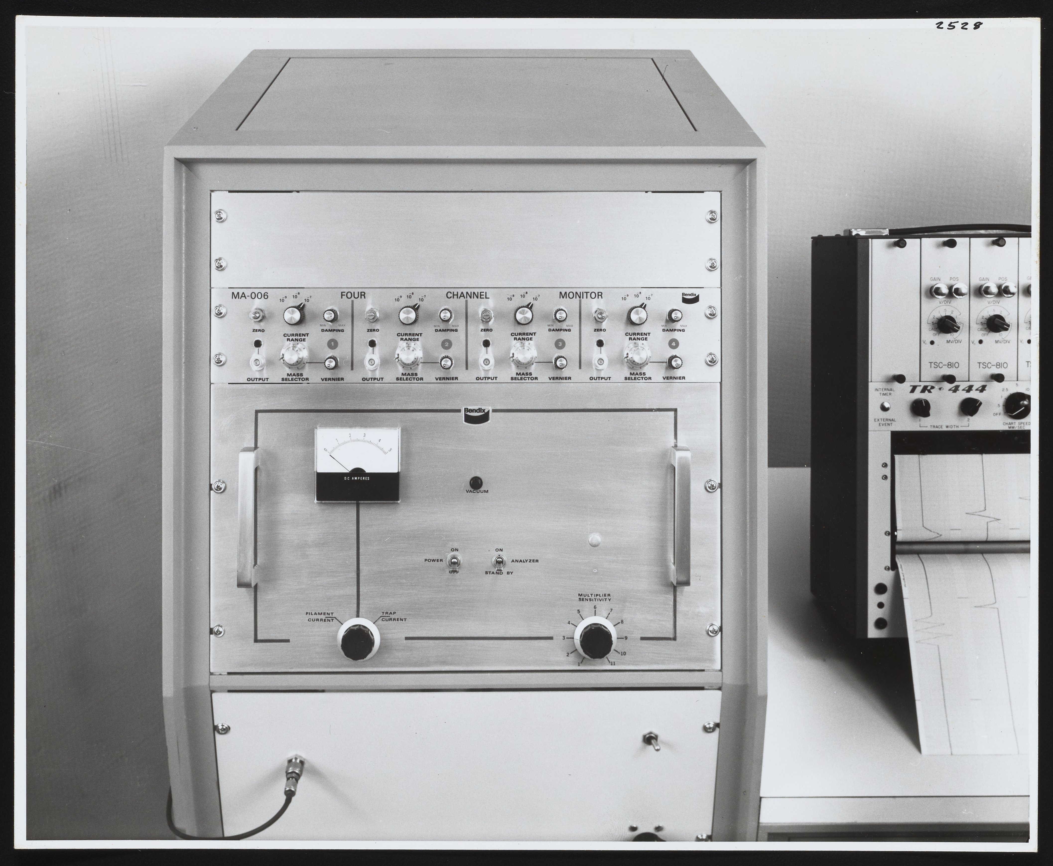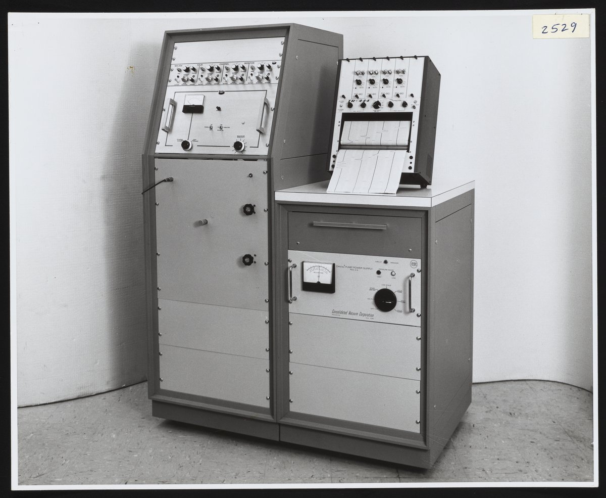 Small JPG1200 x 985px — 168 KBLarge JPG2880 x 2364px — 893 KBFull-sized JPG4244 x 3484px — 1.8 MBOriginal fileTIFF — 4244 x 3484px — 42.3 MBThree views of assorted accessories, including a Model MA-006 Four Channel Monitor and Consolidated Vacuum Corporation DRIVAC Pump Power Supply, believed to intended for use with the Bendix Corporation Time-of-Flight Mass Spectrometer. The Time-of-Flight Mass Spectrometer (TOFMS) was the flagship analytical instrument of the Bendix Corporation.