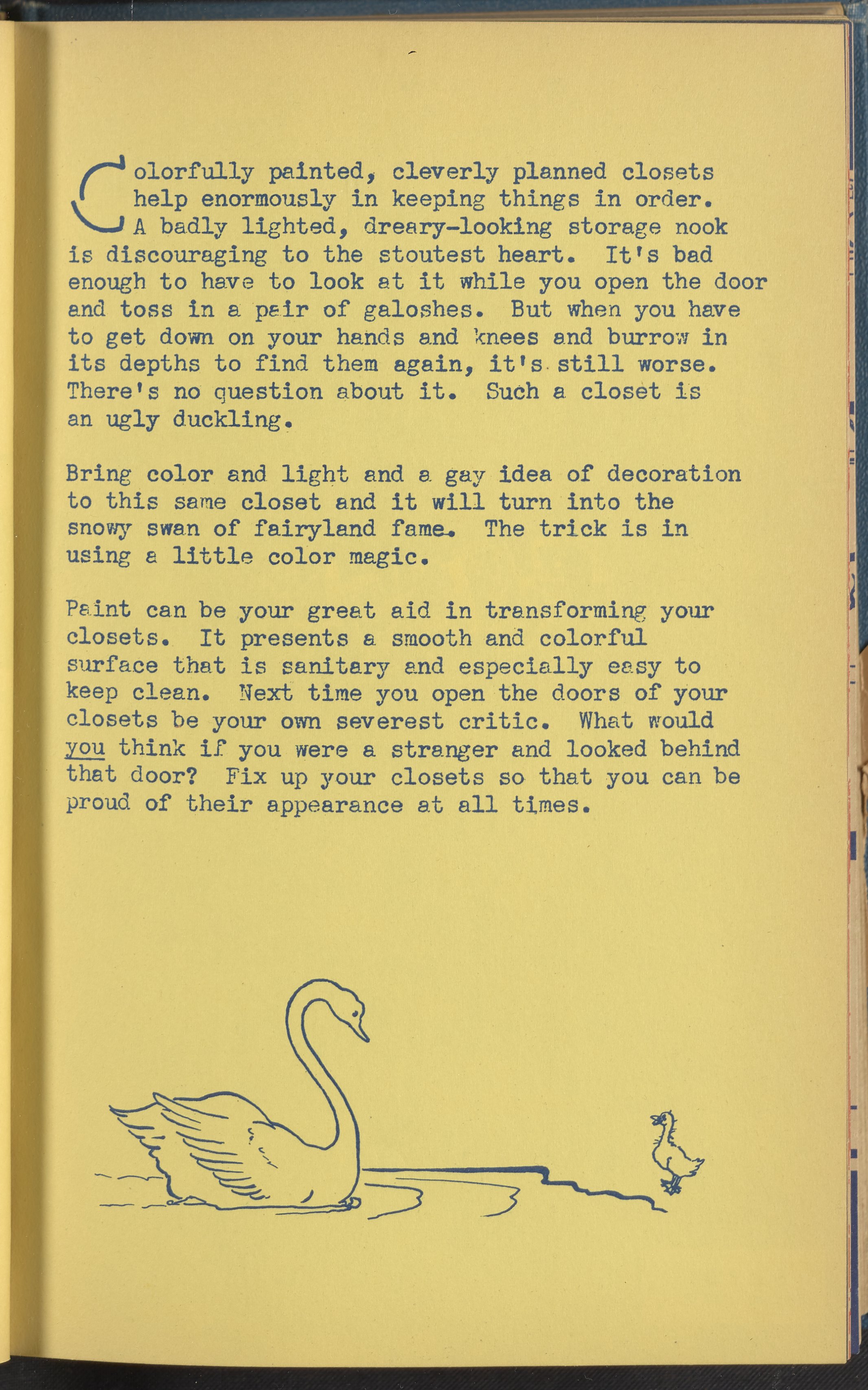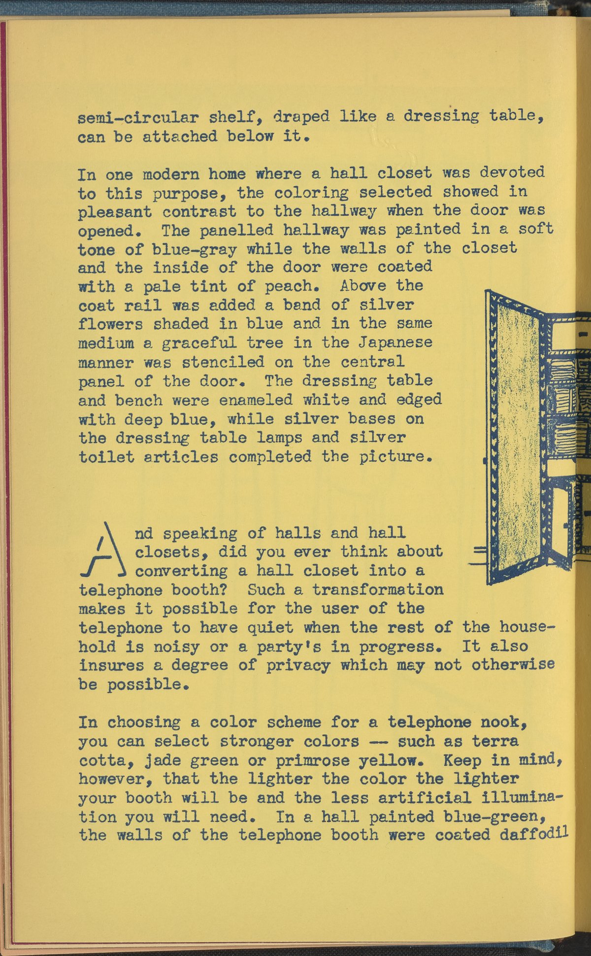 Booklet corresponding to a radio broadcast program created by the National Paint, Varnish, and Lacquer Association. The booklet discusses how to organize or repurpose a home's hall closet. Lists the possibilities for the closet, such as converting it into a powder room, a telephone booth, or a linen closet. Describes how to decorate and furnish the space for each possibility. Then, explains how to organize a closet shared by a couple. Includes small stylized illustrations throughout and decorated covers.