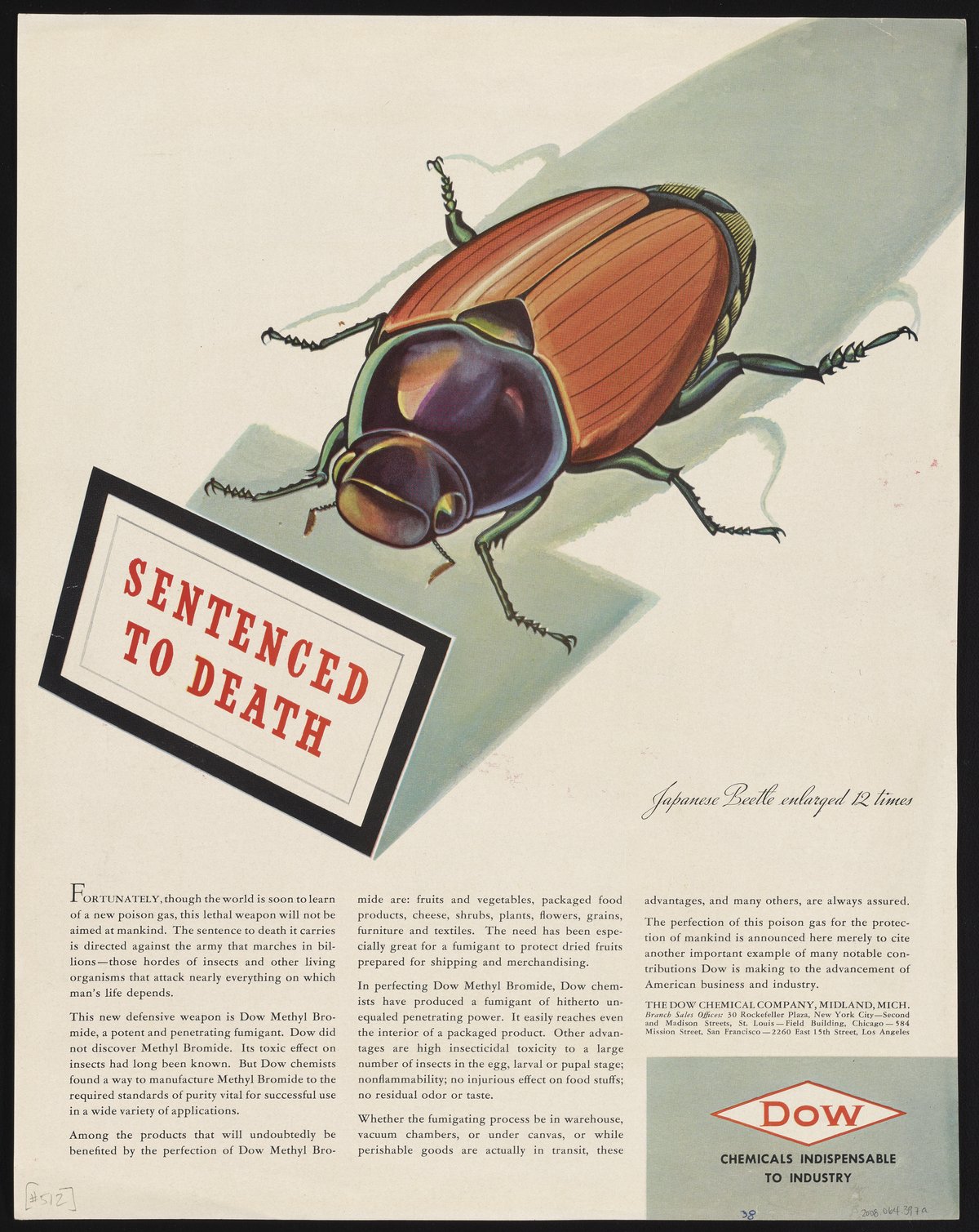 Dow Chemical Company. “Sentenced to Death,” 1938. Advertisements from the Dow Chemical Historical Collection, Box 9. Science History Institute. Philadelphia. https://digital.sciencehistory.org/works/26mzn00.