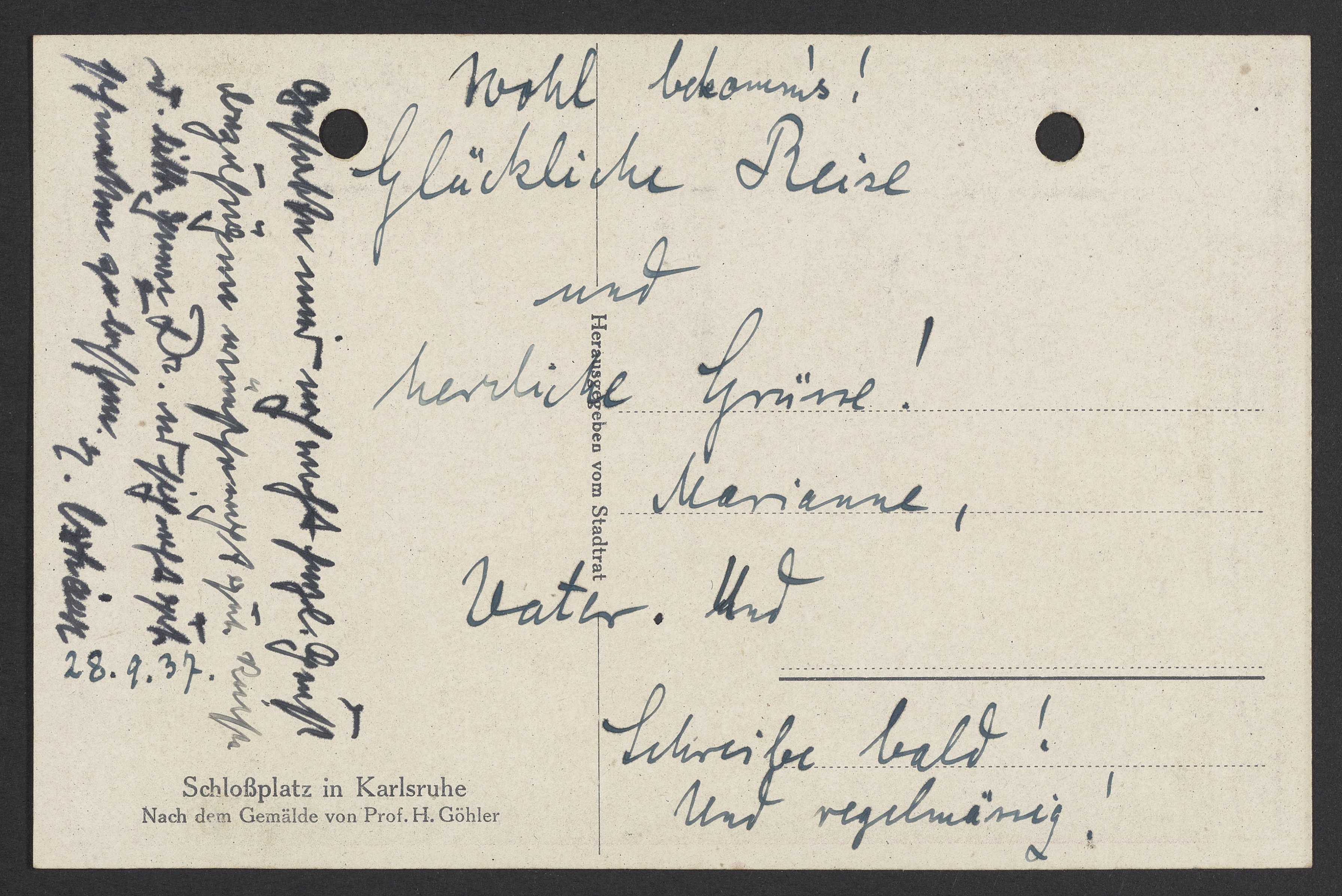 Postcard to Max Bredig from Georg Bredig and Marianne Homburger, September 28, 1937