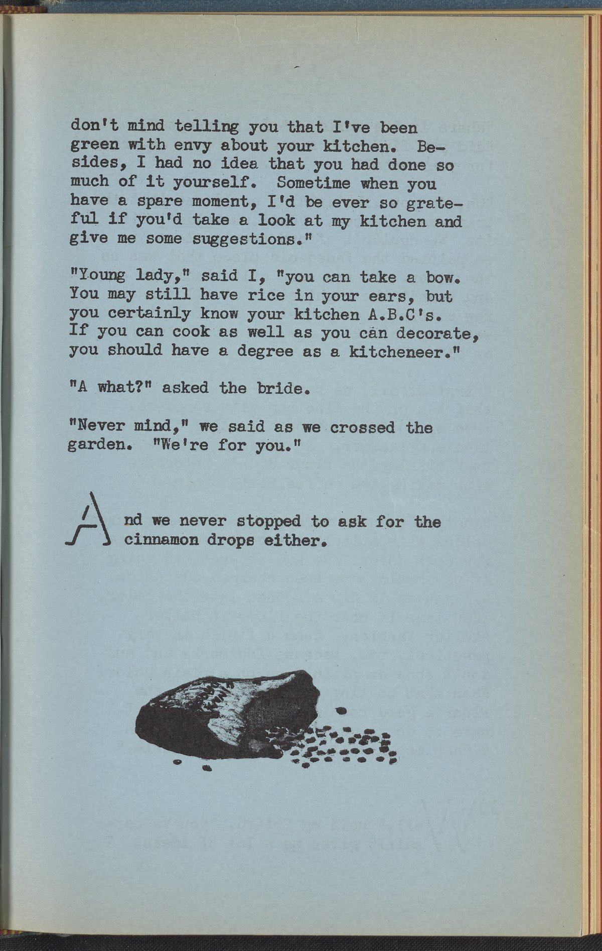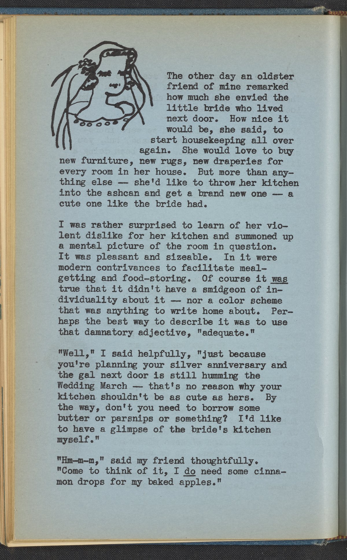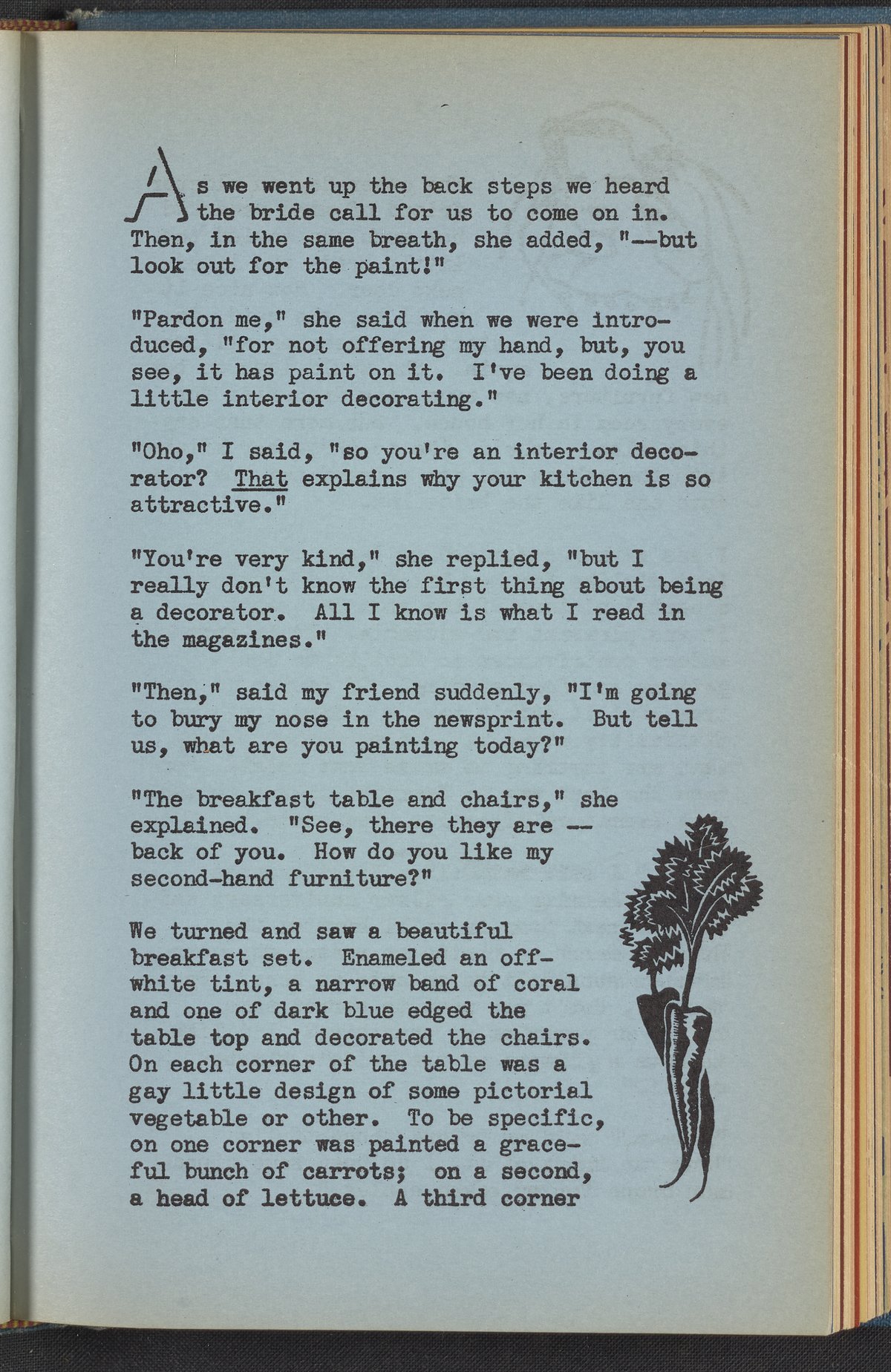 Booklet corresponding to a radio broadcast program created by the National Paint, Varnish, and Lacquer Association. The booklet includes dialogue between two neighbors, a young bride and an older woman. After learning that the young bride has decided to paint her kitchen, the older neighbor is inspired and decides it's time to spruce up her kitchen as well. Includes small stylized illustrations throughout and decorated covers.