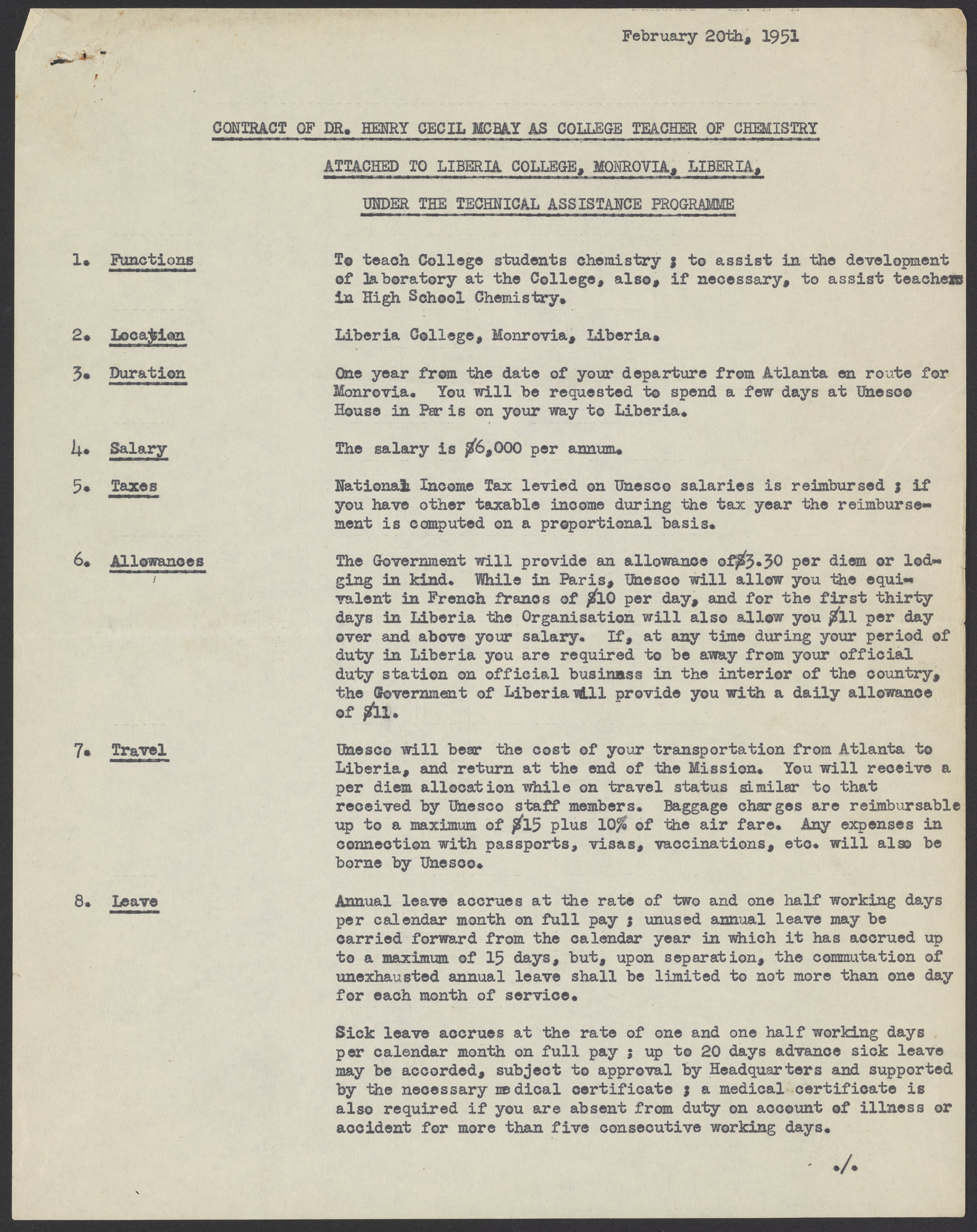 Henry McBay's teaching contract for Liberia College
