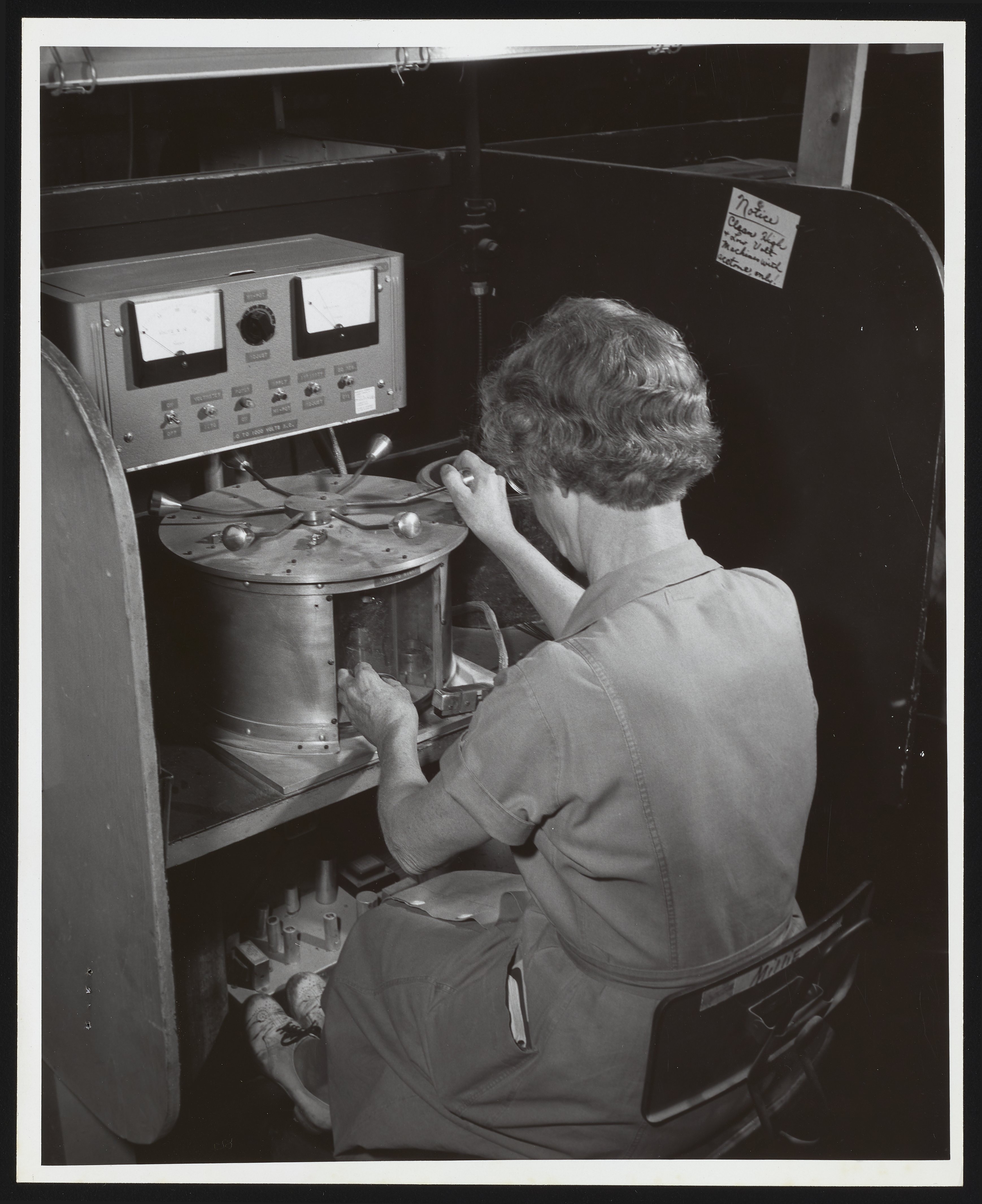 General view of an unidentified female employee operating an apparatus used to test special electric detonators manufactured at the Hercules Powder Company plant in Port Ewen, New York. Formed in 1912 as part of an anti-trust settlement with DuPont, the Hercules Powder Company (later Hercules Inc.) specialized in the manufacture of explosives and smokeless powders. The company's Port Ewen plant produced a range of special detonators designed for military use, as well as construction jobs that required blasts of dynamite, such as the clearing of quarries, mines, and tunnels.