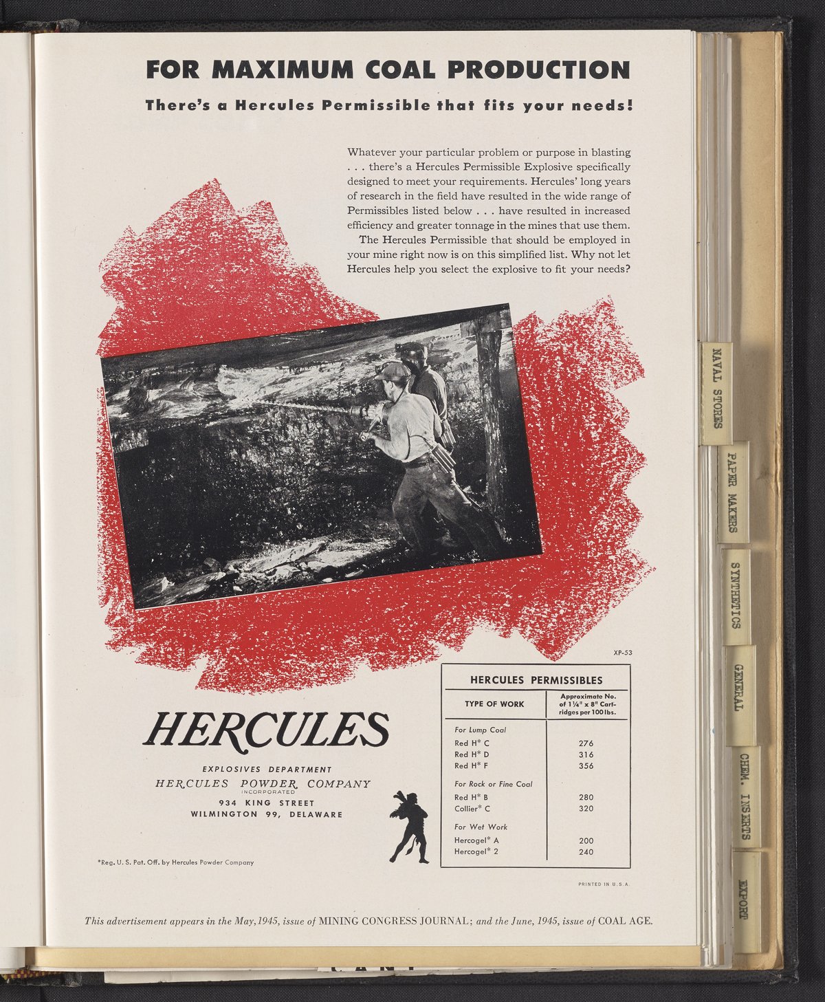 Hercules Incorporated. “For Maximum Coal Production...There's a Hercules Permissible That Fits Your Needs!” 1945 Hercules Advertisements, 1945. Records of Hercules Incorporated, Volume 1945. Science History Institute. Philadelphia. https://digital.sciencehistory.org/works/2801ph009.