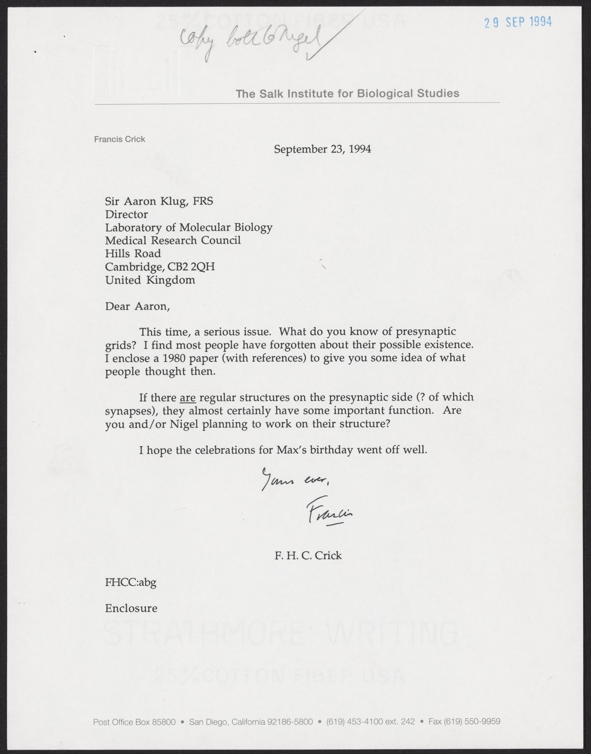 Letter from Francis Crick to Aaron Klug, September 23, 1994