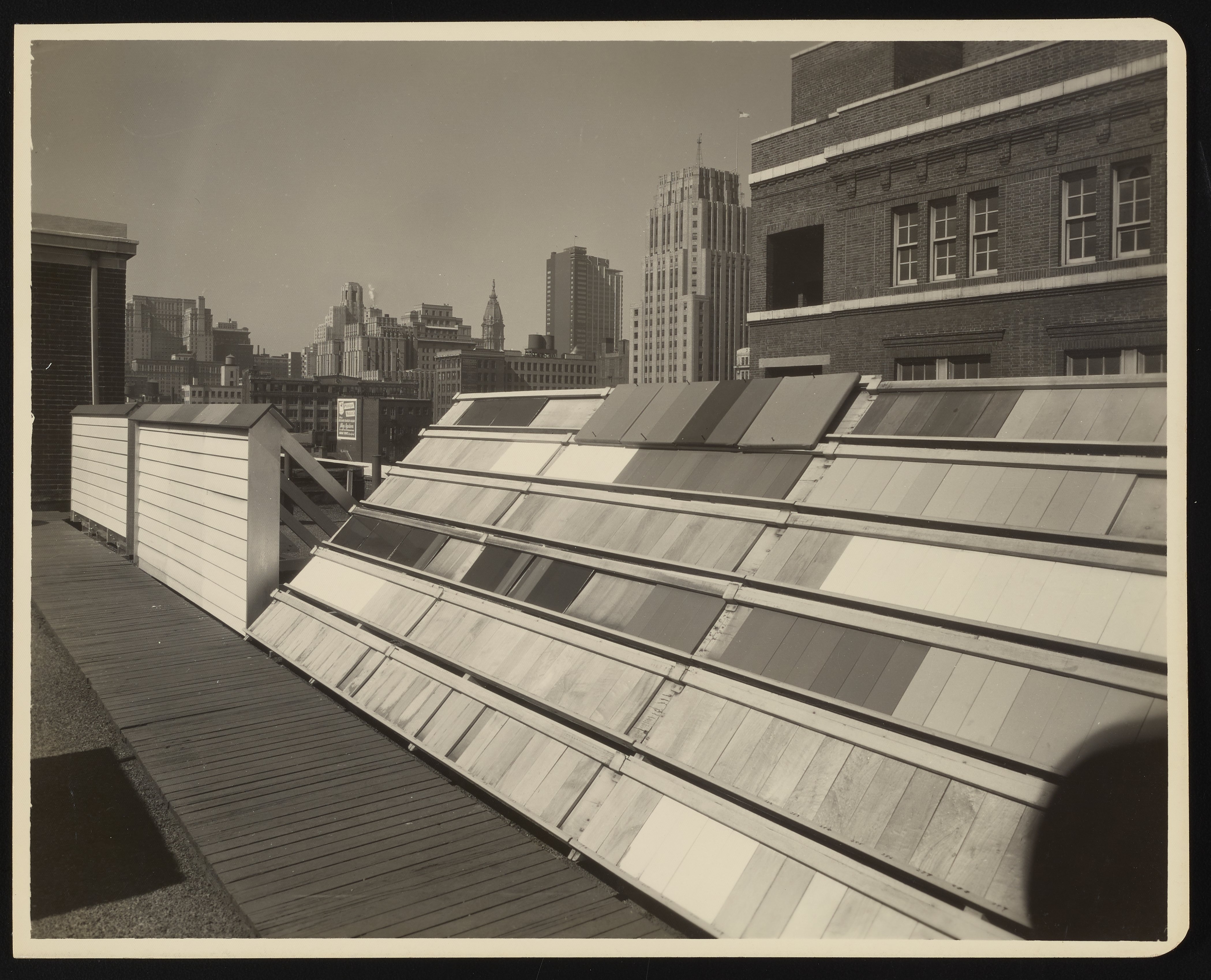 Small JPG1200 x 972px — 196 KBLarge JPG2880 x 2332px — 918 KBFull-sized JPG4197 x 3398px — 1.7 MBOriginal fileTIFF — 4197 x 3398px — 40.9 MBTwo views of exposure racks designed to test the weathering capabilities of varnishes and other products manufactured by the Rohm and Haas Company. The racks are positioned on the roof of the company's home office building located at West Washington Square in Philadelphia.