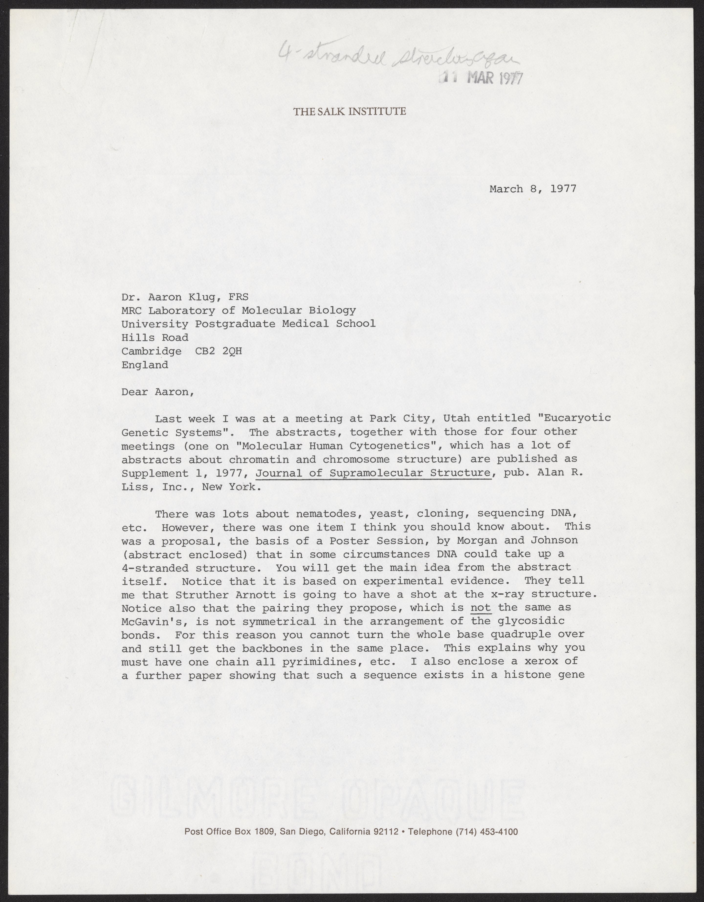 Crick, Francis. “Letter from Francis Crick to Aaron Klug, March 8, 1977,” March 8, 1977. History of Molecular Biology Collection, Box 19, Folder 26. Science History Institute. Philadelphia. https://digital.sciencehistory.org/works/29xc0q9.
