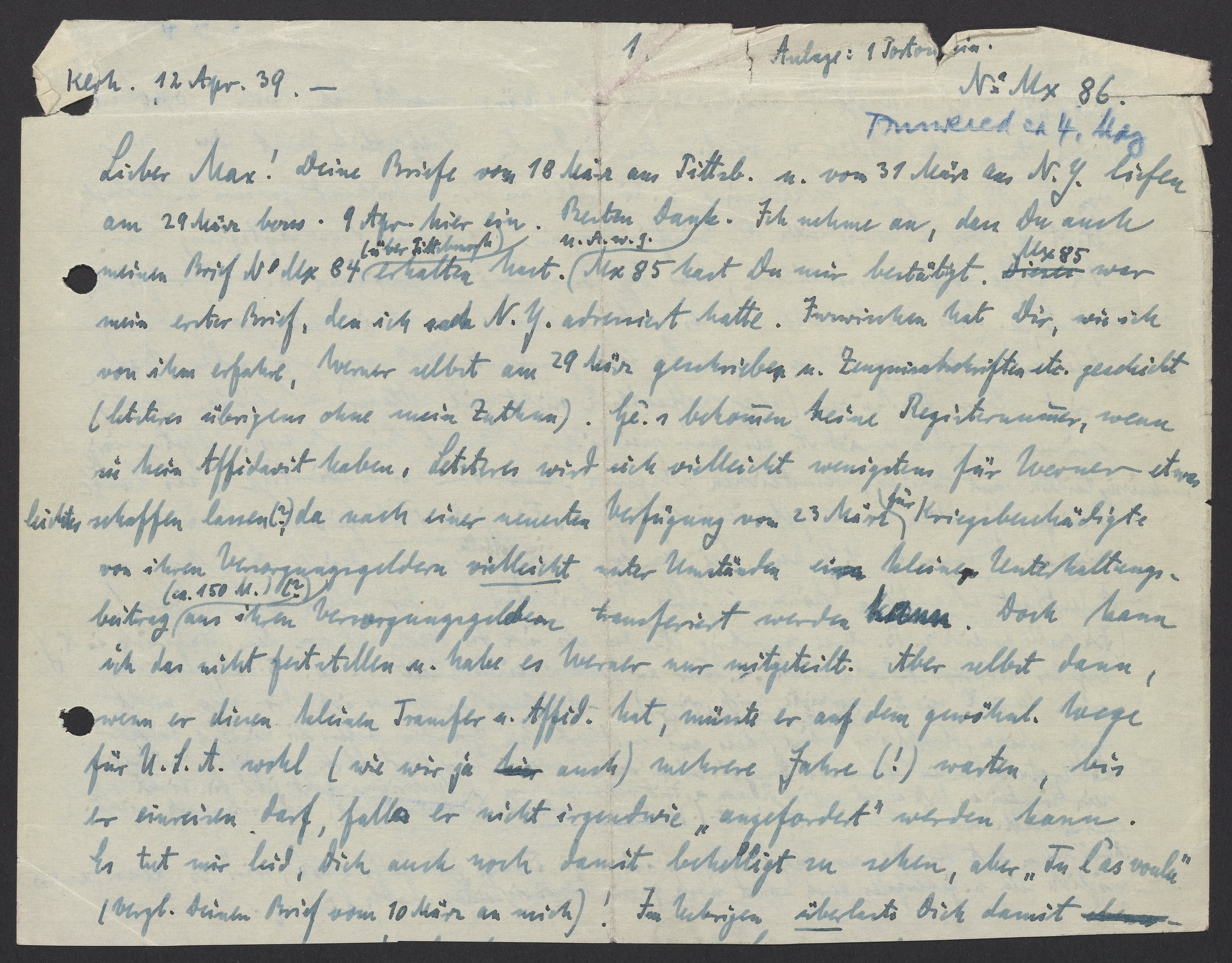 Lieber Max! Deine Briefe vom 18. Maerz aus Pittsburgh u. vom 31. März aus N.Y. liefen am 29 März bezw. 9. April hier ein. Besten Dank. Ich nehme an, dass Du auch meinen Brief No Mx 84 (über Pittsburgh) erhalten hast. Mx 85 hast Du nur bestätigt. Mx 85 war mein erster Brief, den ich nach N.Y. adressiert hatte. Inzwischen hat Dir, wie ich von ihm erfahre, Werner selbst am 29. Maerz geschrieben u. Zeugnisschriften etc. geschickt (letzteres übrigens ohne mein Zuthun). Ge.‘s bekommen keine Registriernummer, wenn sie kein Affidavit haben. Letzteres wird sich vielleicht wenigstens fuer Werner etwas leichtes schaffen lassen (?), da nach einer neuersten Verfügung von 23 Maerz fuer Kriegsbeschädigte von ihren Versorgungsgeldern vielleicht unter Umständen ein kleiner Unterhaltungsbeitrag (ca. 150 M ?) aus ihren Versorgungsgeldern transferiert werden kann. Doch kann ich das nicht feststellen u. habe es Werner nur mitgeteilt. Aber selbst dann, wenn er diesen kleinen Transfer u. Affidavit hat, müsste er auf dem gewöhnlichen Wege fuer U.S.A. wohl (wie wir ja auch) mehrere Jahre (!) warten, bis er einreisen darf, falls er nicht irgendwie „angefordert“ werden kann. Es tut mir leid, Dich auch noch damit behelligt zu sehen, aber „tu l’as voulou“ (vergl. Deinen Brief vom 10 März an mich)! Im Übrigen überlaste Dich damit