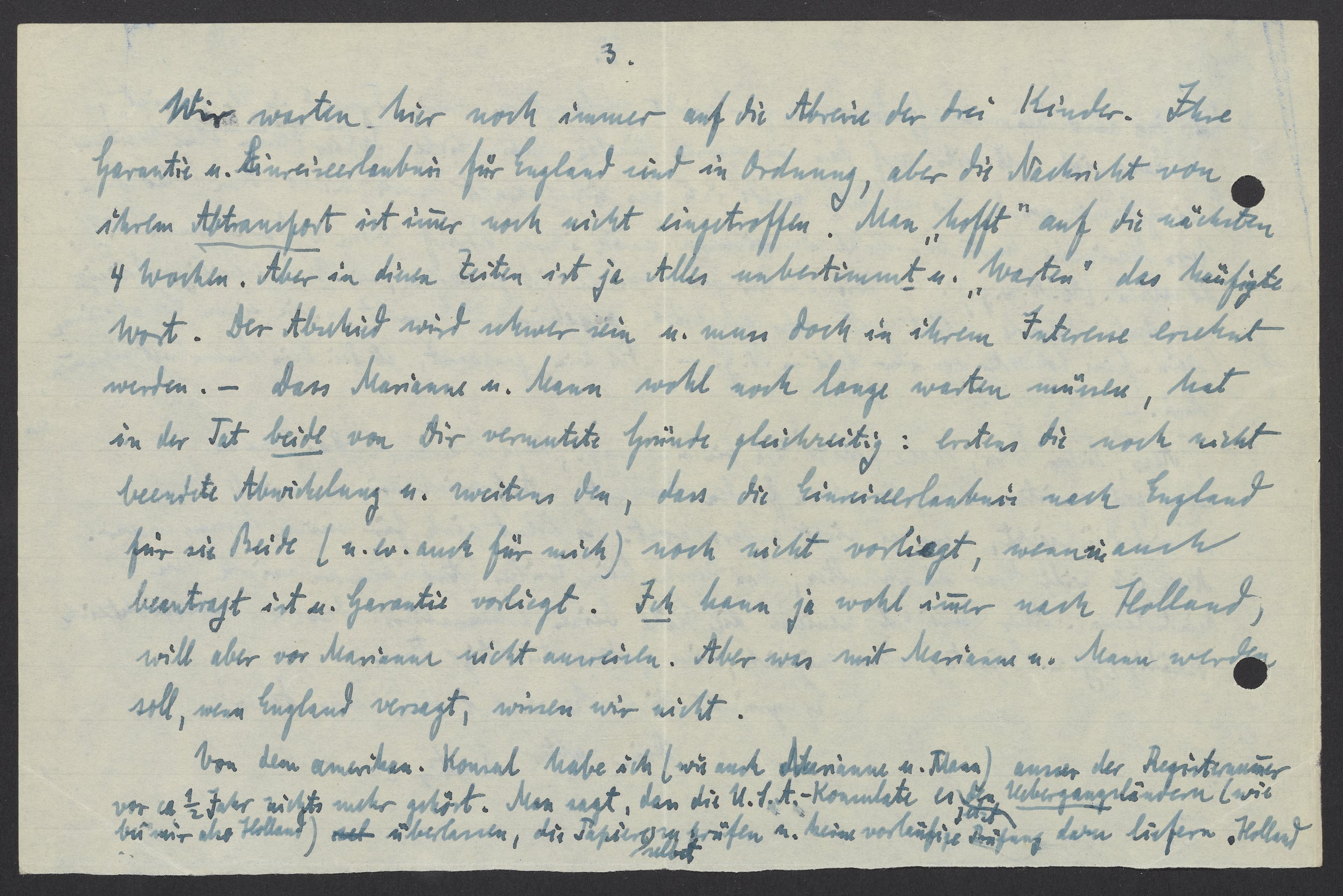 Wir warten hier noch immer auf die Abreise der drei Kinder. Ihre Garantie u. Einreiseerlaubnis fuer England sind in Ordnung, aber die Nachricht von ihrem Abtransport ist immer noch nicht eingetroffen. Man „hofft“ auf die nächsten 4 Wochen. Aber in diesen Zeiten ist ja Alles unbestimmt u. „Warten“ das häufigste Wort. Der Abschied wird schwer sein u. muss doch in ihrem Interesse ersehnt werden.- Dass Marianne u. Mann wohl noch lange warten müssen, hat in der Tat beide von Dir vermutete Gründen gleichzeitig: erstens die nach nicht beendete Abwicklung u. Weitens den, dass die Einreiseerlaubnis nach England beantragt ist u. Garantie vorliegt. Ich kann ja wohl immer nach Holland, will aber vor Marianne nicht aus reisen. Aber was mit Marianne u. Mann werden soll, wenn England versagt, wissen wir nicht.