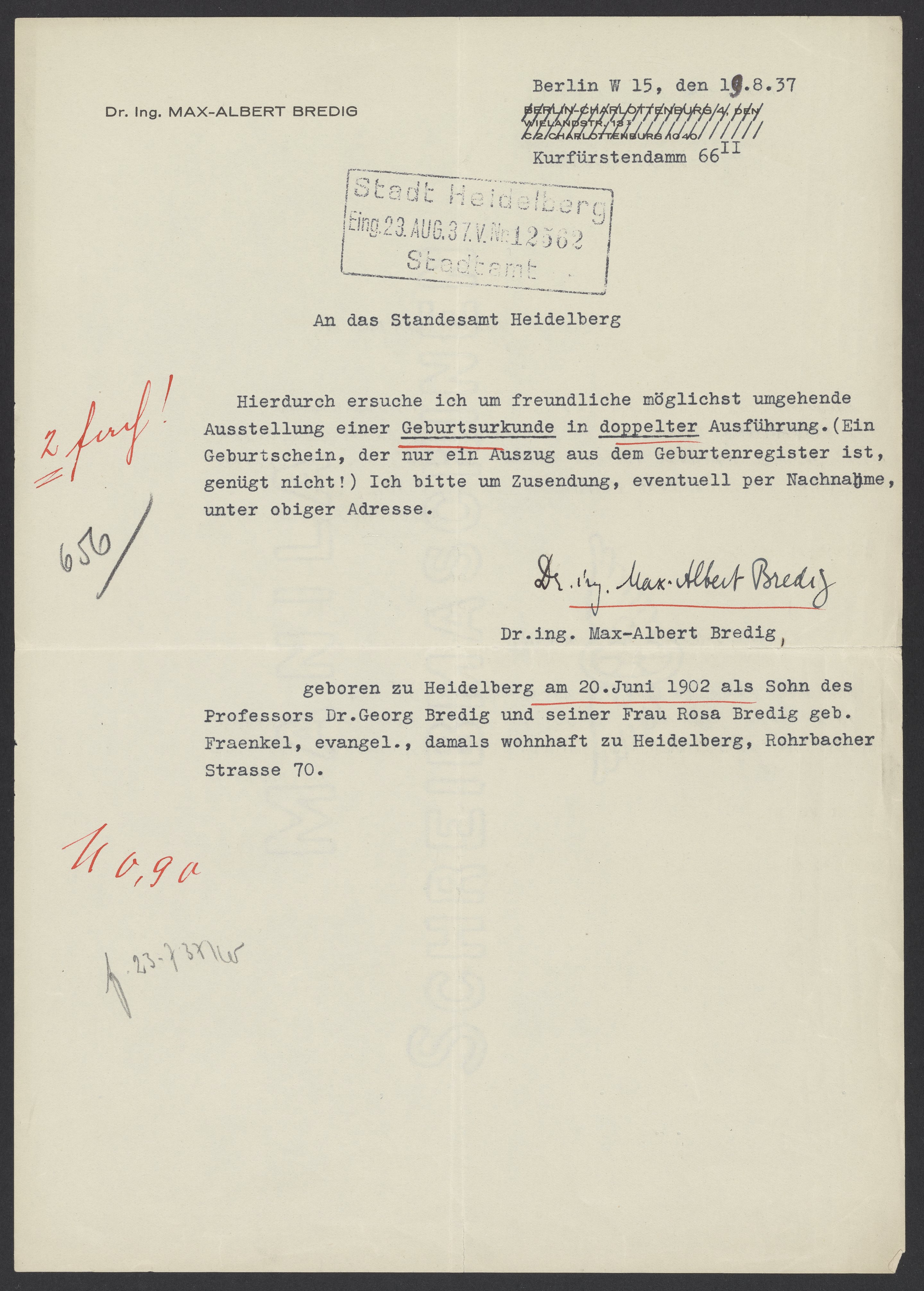 Letter from Max Bredig to the Registry Office of Heidelberg, August 19, 1937