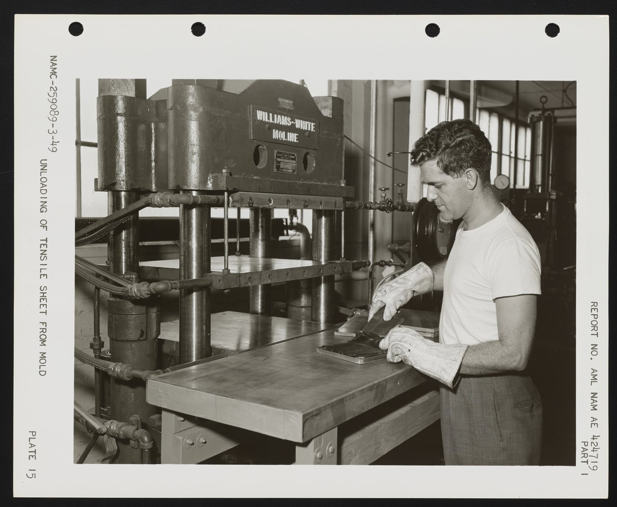 View of a worker removing a tensile sheet from a mold used in the hydraulic press at the Naval Air Experimental Station's Rubber Compounding and Processing Laboratory. The hydraulic press is a 200-ton capacity Williams-White Moline machine equipped with three 24" x 24" cored steam platens and pull-back pistons for rapid pressure release. At the laboratory, the hydraulic press was used to cure, i.e. toughen or harden, molded rubber articles. This photograph was included in a 1949 Naval Air Experimental Station report on compounding rubber.