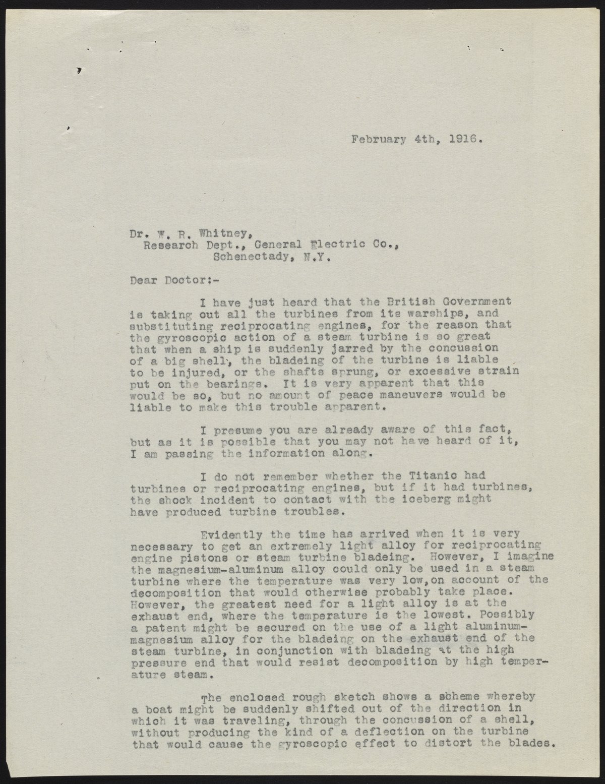 Letter from Herbert H. Dow to Dr. Willis R. Whitney, February 4, 1916
