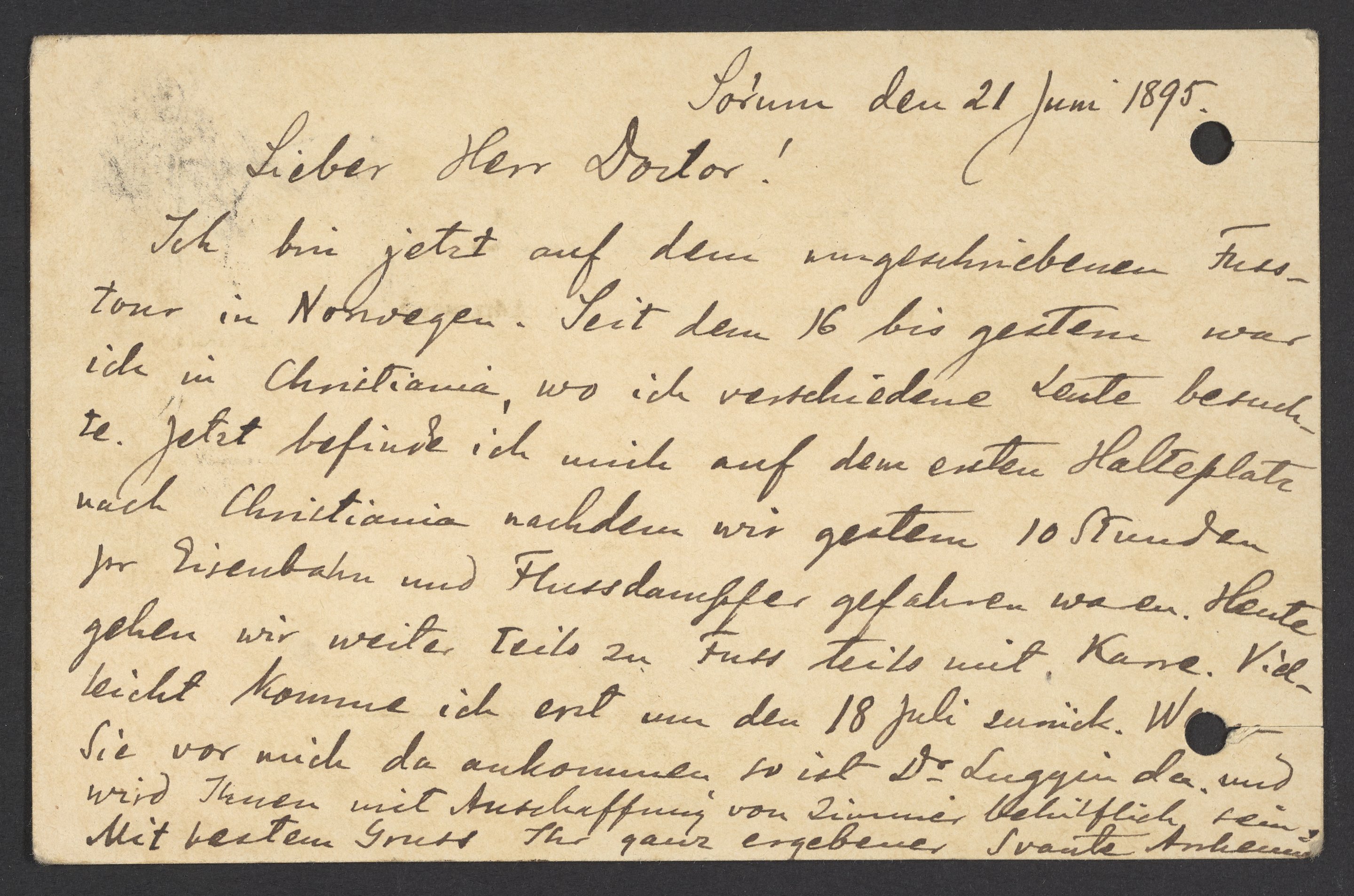 Ich bin jetzt auf dem umgeschriebenen Fusstour in Norwegen. Seit dem 16 bis gestern war ich in Christiana, wo ich verschiedene Leute besuchte. Jetzt befinde ich mich auf dem ersten Halteplatz nach Christiana nachdem wir gestern 10 Stunden per Eisenbahn und Flussdampfer gefahren waren. Heute gehen wir weiter teils zu Fuss teils mit Karre. Vielleicht komme ich erst um den 18. Juli zurück. Wenn Sie vor mich da ankommen, so ist Dr. Luggin da und wird Ihnen mit Anschaffung von Zimmer behilflich sein. Mit bestem Gruss Ihr ganz ergebener Svante Arrhenius