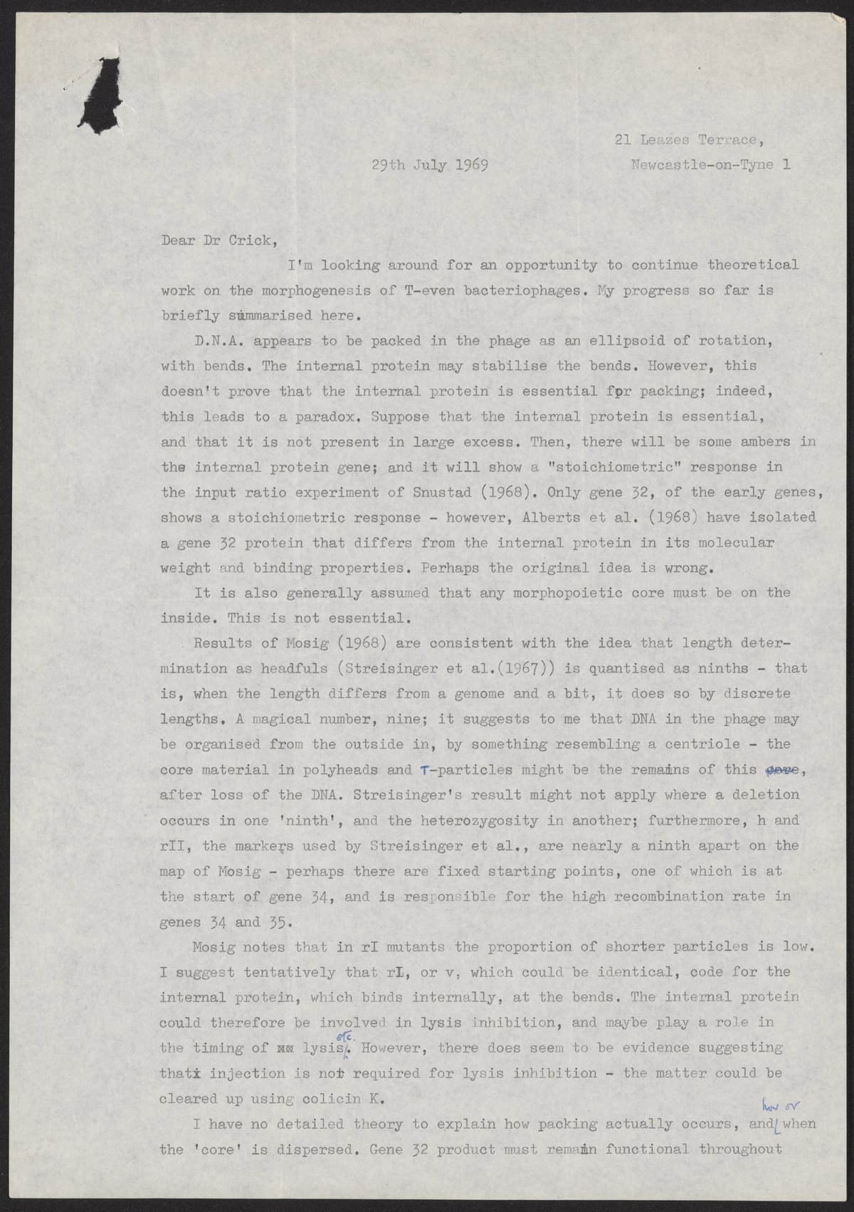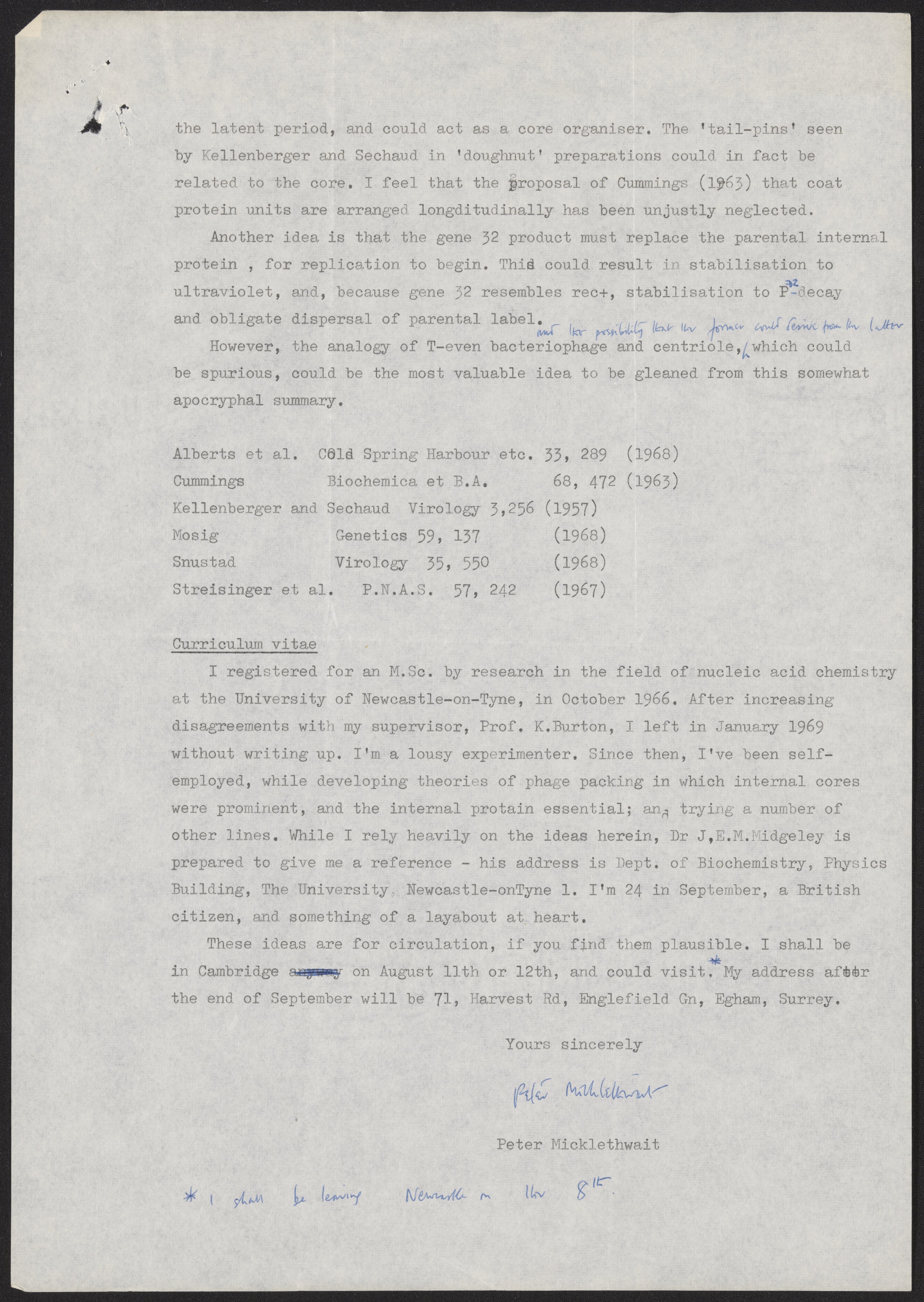 Micklethwait, Peter. “Letter from Peter Micklethwait to Francis Crick, July 29, 1969,” July 29, 1969. History of Molecular Biology Collection, Box 20, Folder 8. Science History Institute. Philadelphia. https://digital.sciencehistory.org/works/2e0h42n.