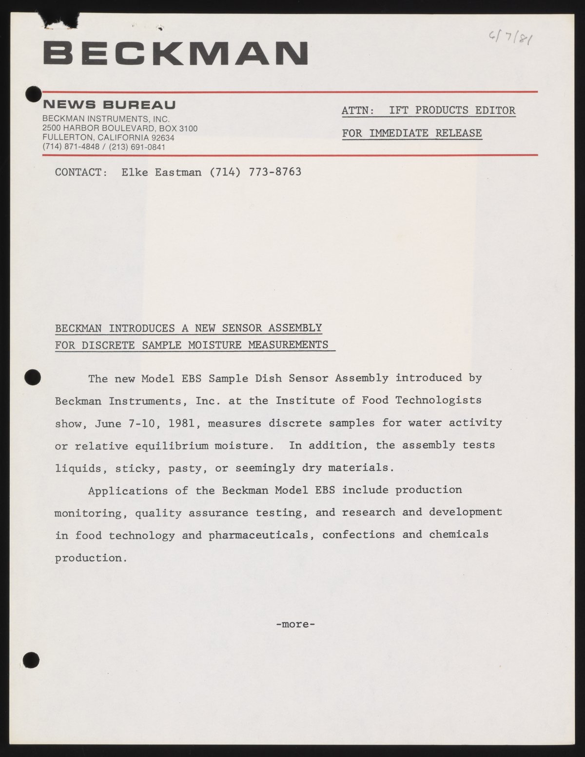 Beckman Introduces a New Sensor Assembly for Discrete Sample Moisture Measurements
