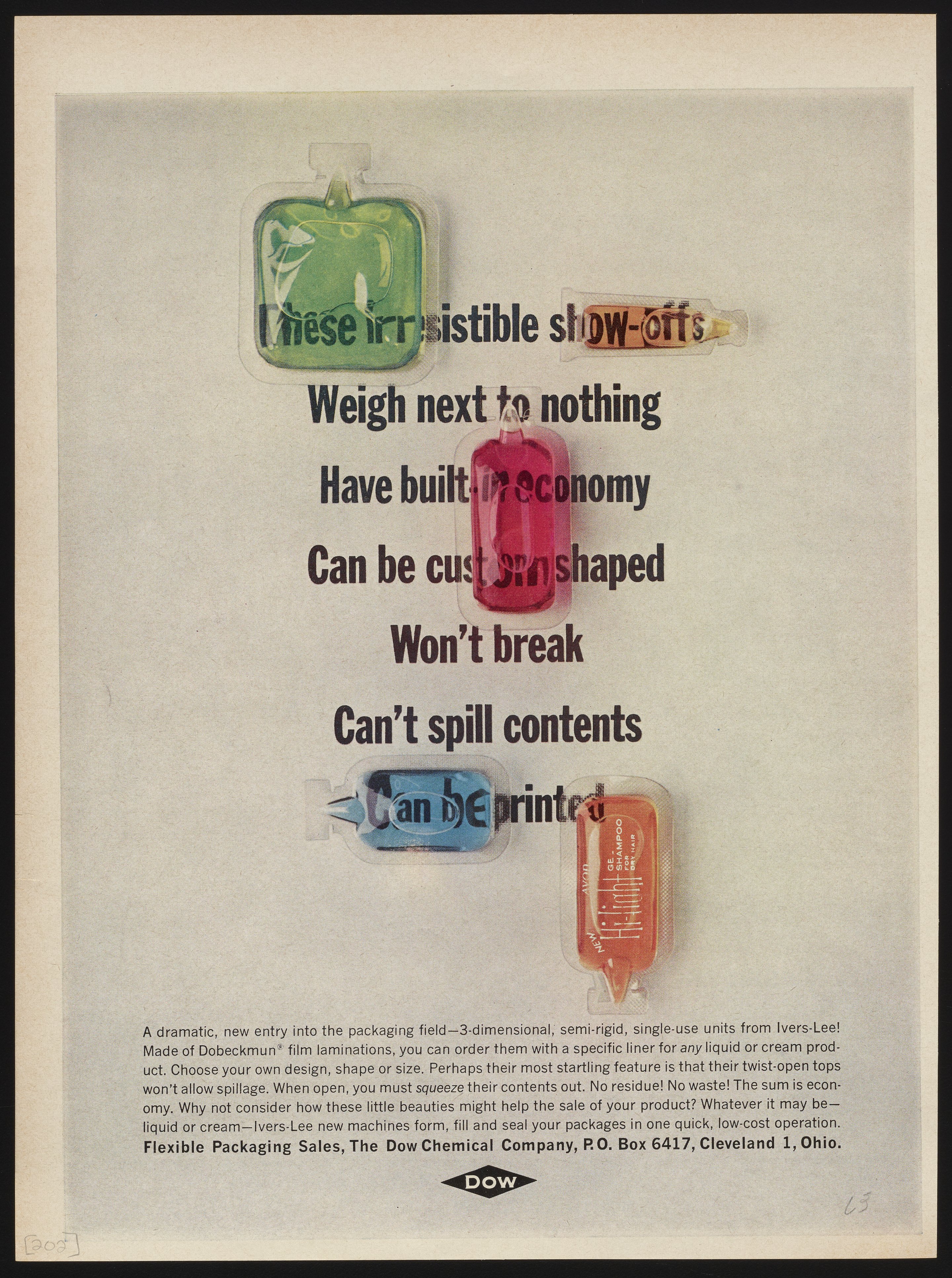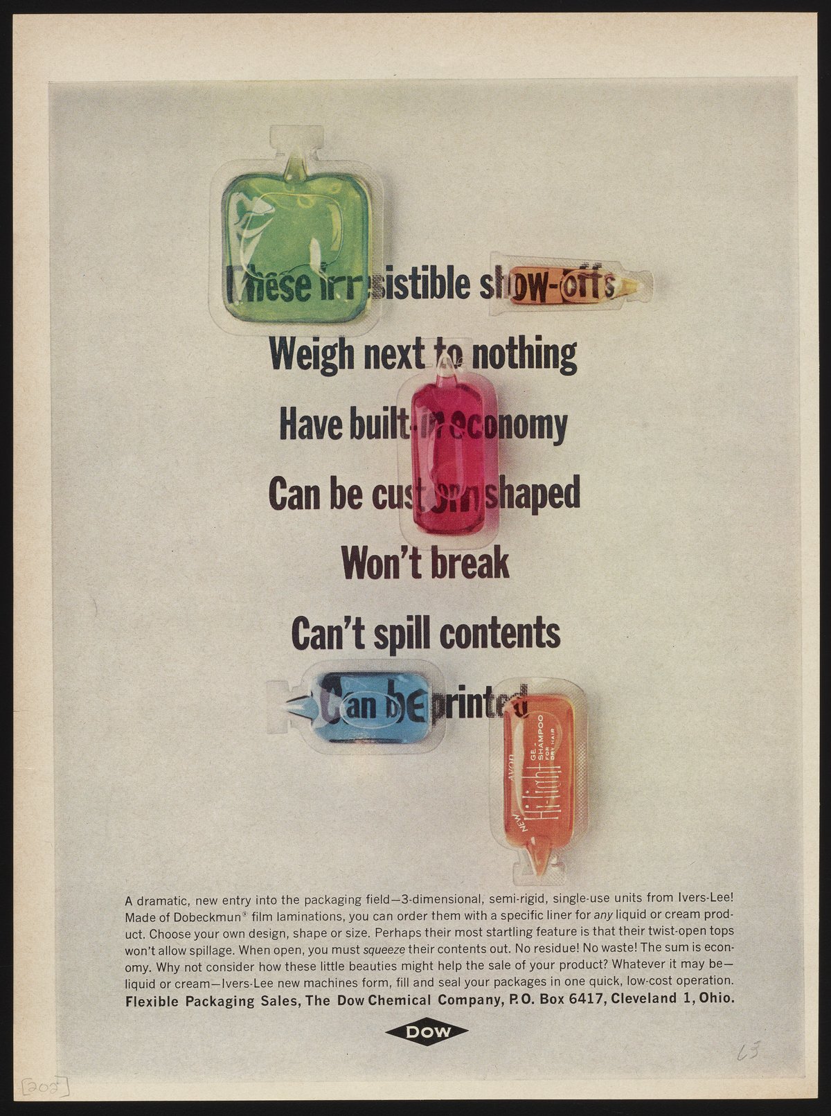 Dow Chemical Company. “Advertisement for Dobeckmun Film Laminations,” 1963. Advertisements from the Dow Chemical Historical Collection, Box 7. Science History Institute. Philadelphia. https://digital.sciencehistory.org/works/2f75r873b.