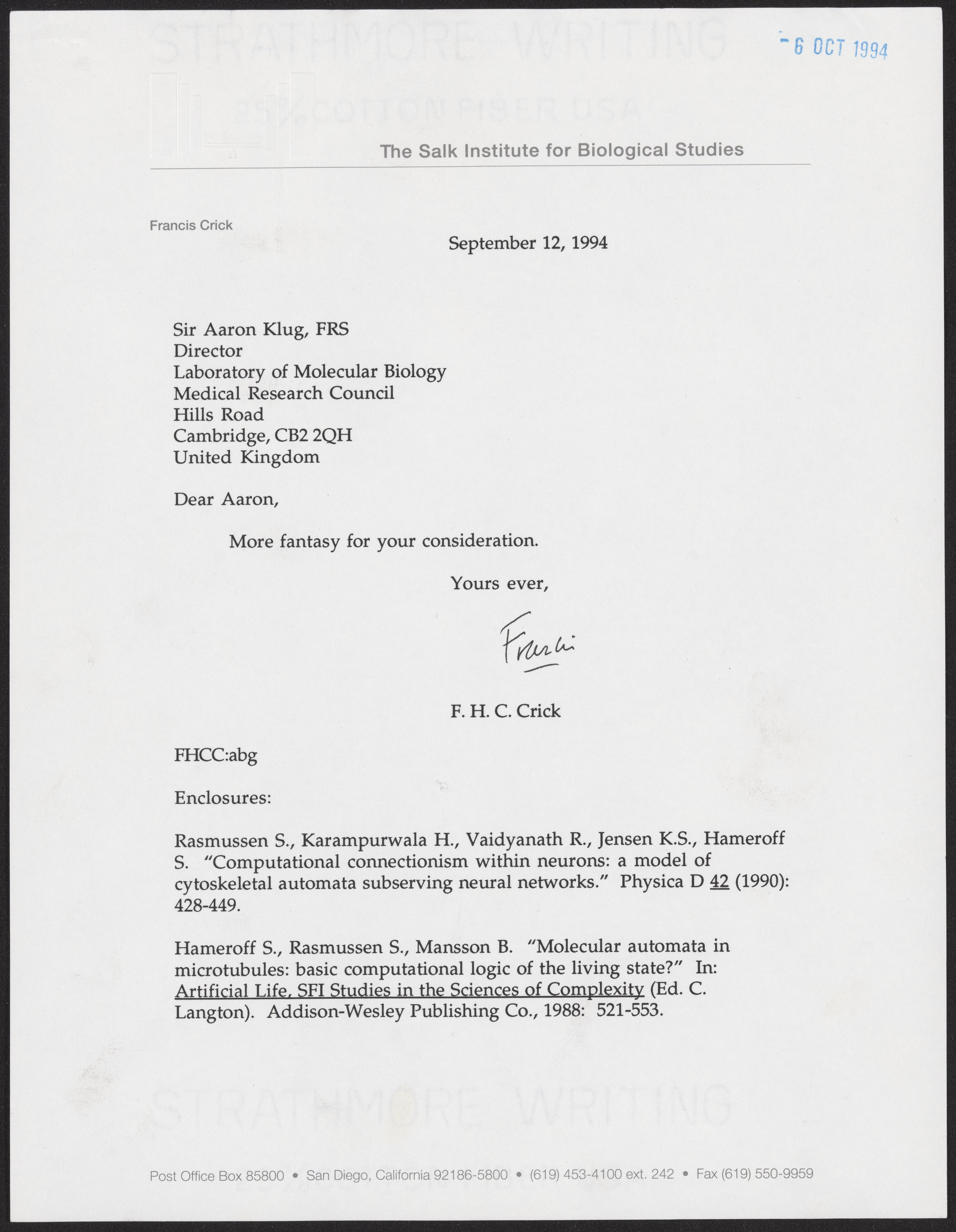 Letter from Francis Crick to Aaron Klug, September 12, 1994