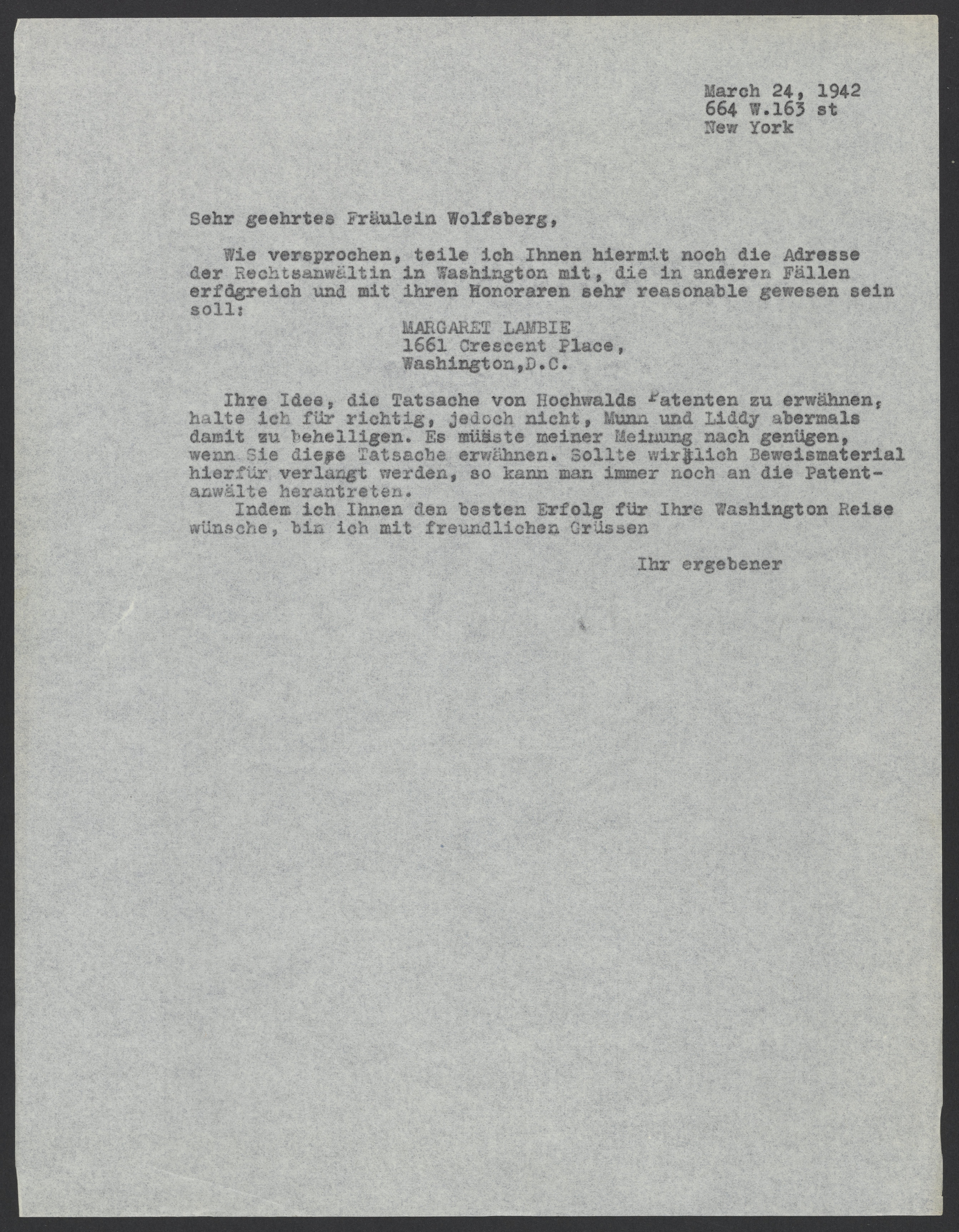 Max Bredig (1902-1977) provides Ilse Wolfsberg with Margaret Lambie's contact information, and advises Wolfsberg against contacting Munn, Anderson, and Liddy, a New York-based law firm, again regarding Fritz Hochwald's (1897-1989) patents.