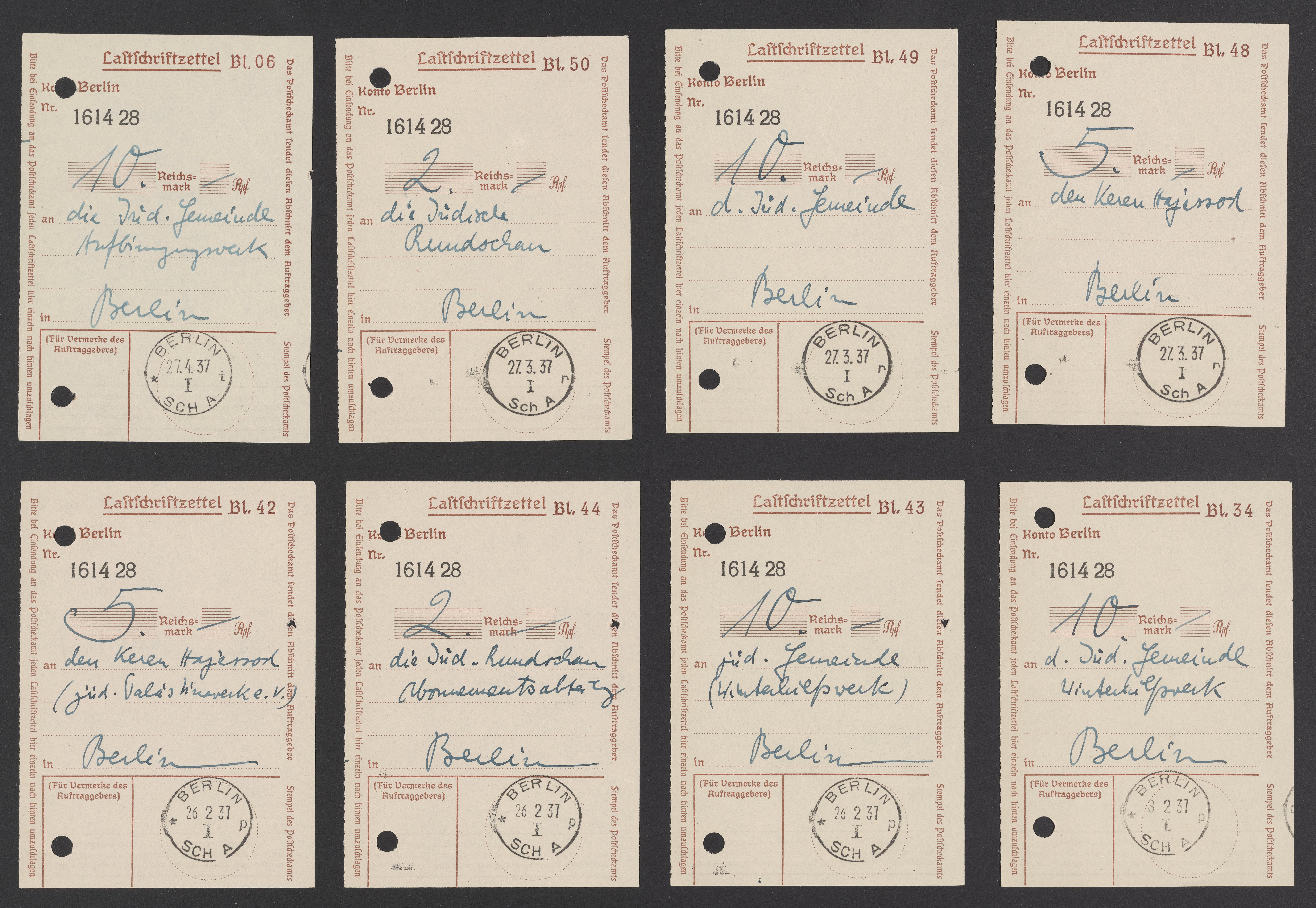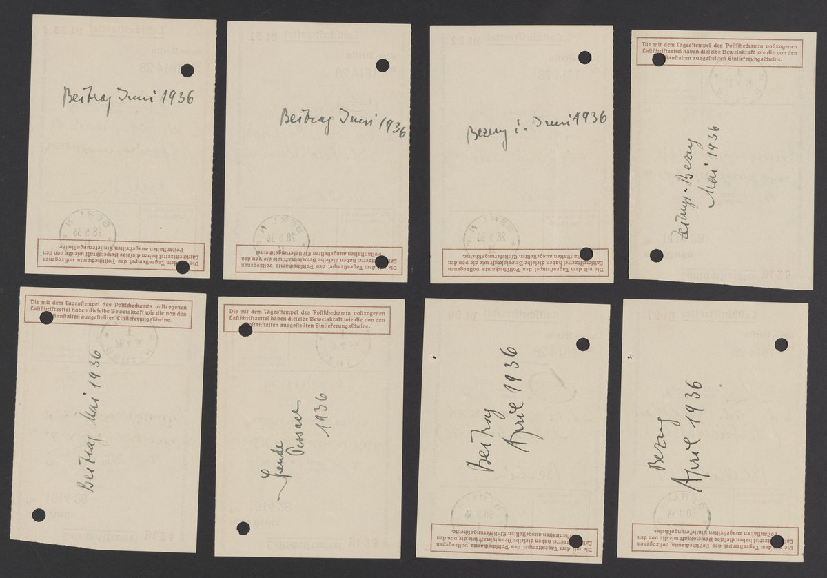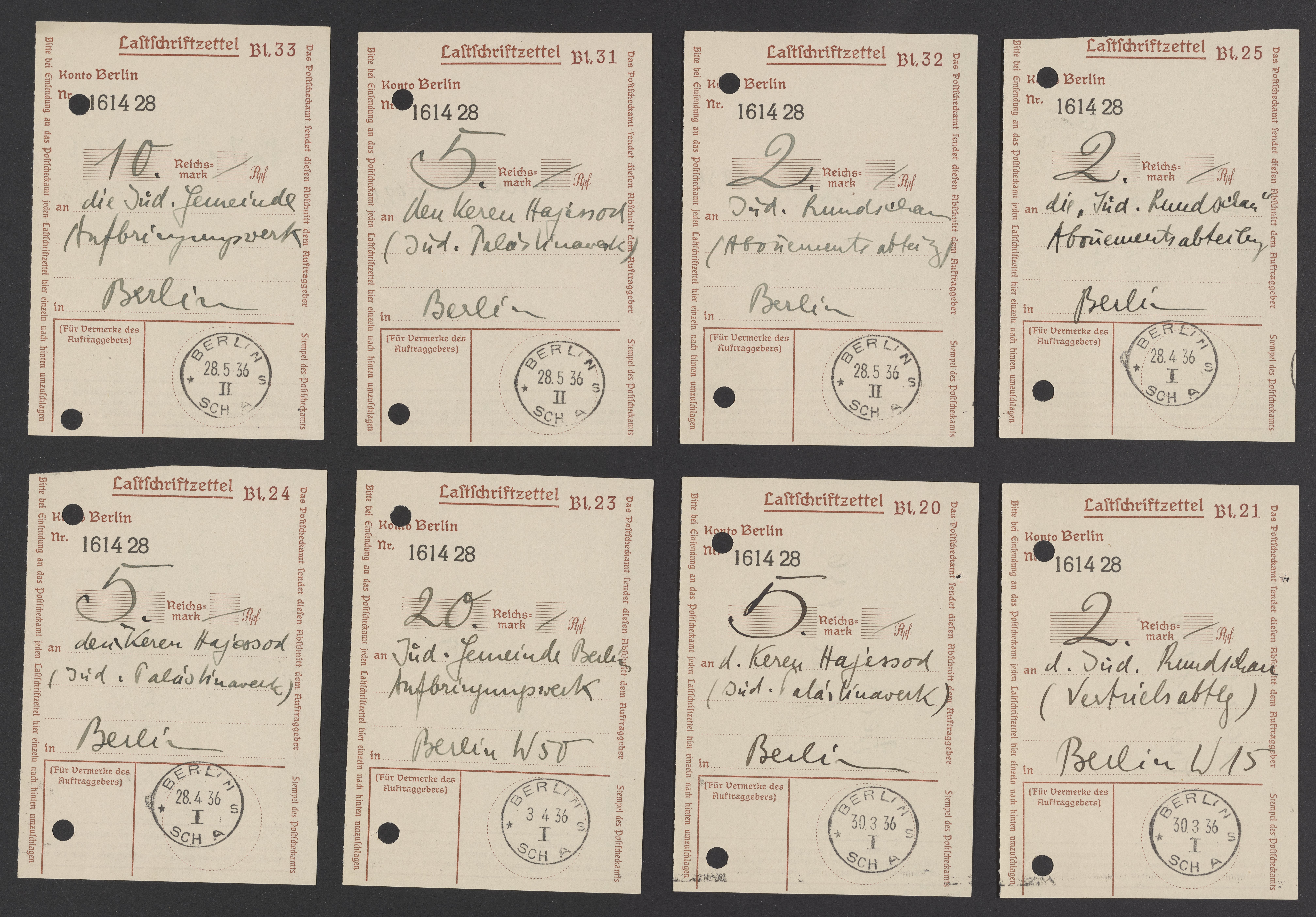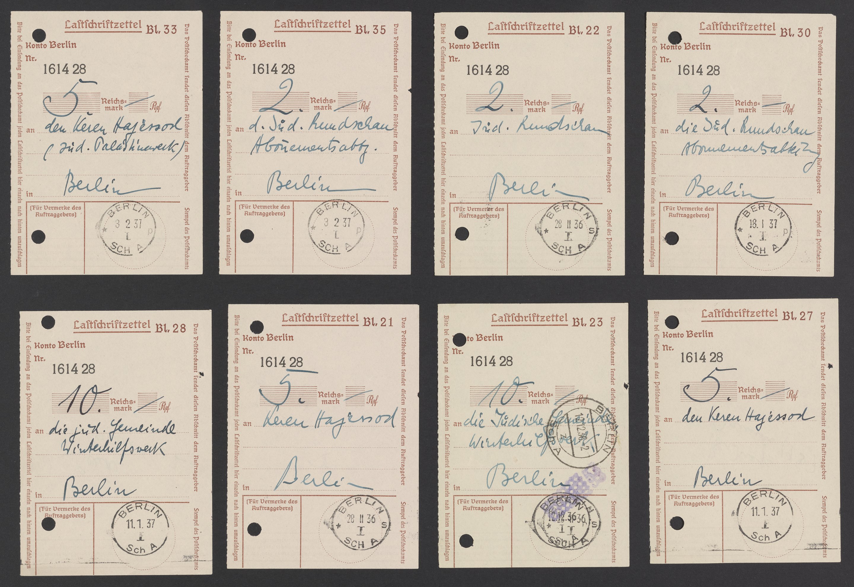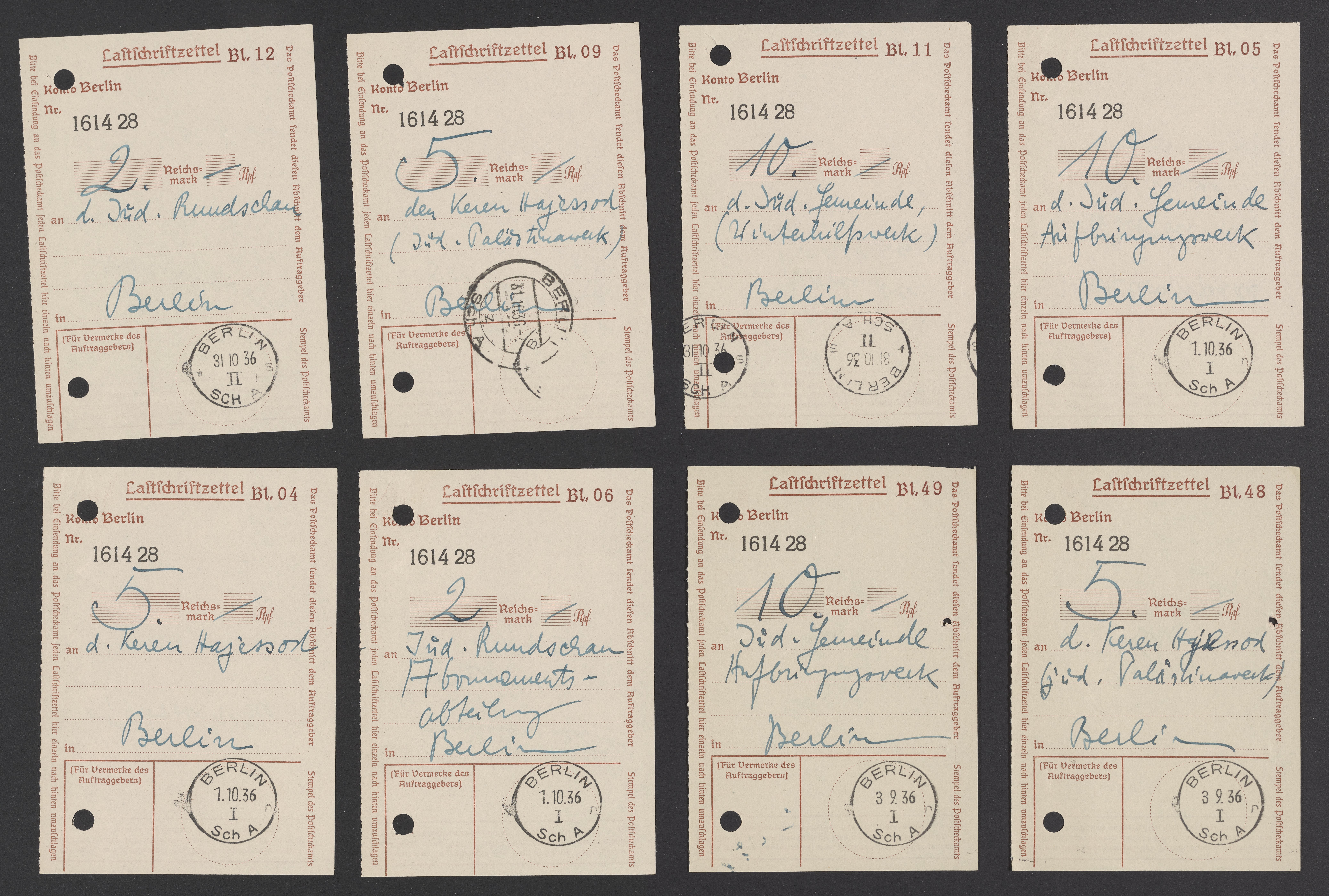 Small JPG1200 x 825px — 195 KBLarge JPG2880 x 1980px — 954 KBFull-sized JPG8188 x 5628px — 6.8 MBOriginal fileTIFF — 8188 x 5628px — 132 MBReceipts for purchases of Judischen Rundschau, a Jewish weekly periodical published in Germany between 1902 and 1938, donations to Keren Hayesod, a Jewish Zionist organization, and other monetary exchanges.