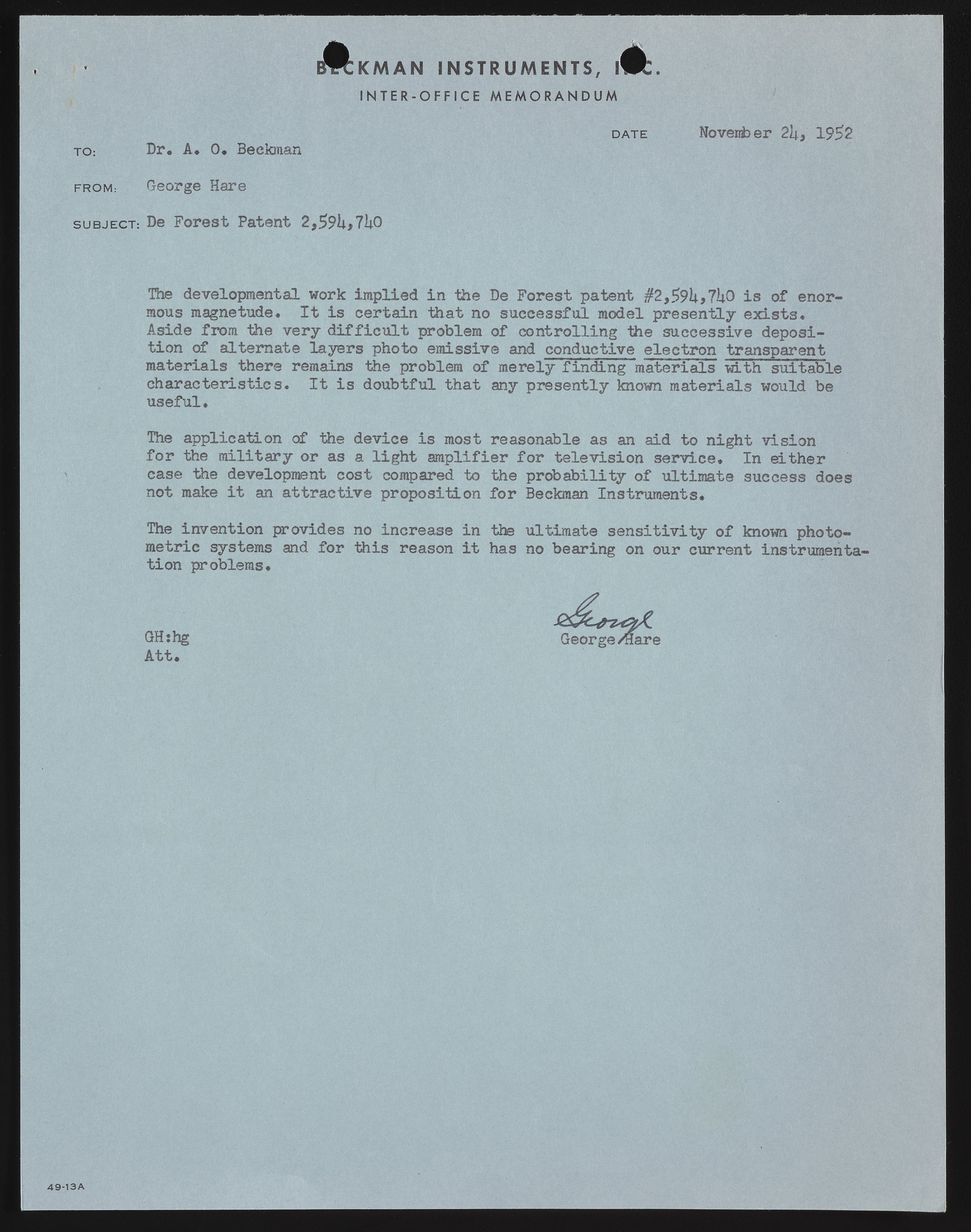 Hare, George H. “Memo from George Hare to Arnold O. Beckman,” November 24, 1952. Beckman Historical Collection, Box 1, Folder 18. Science History Institute. Philadelphia. https://digital.sciencehistory.org/works/2j62s5690.