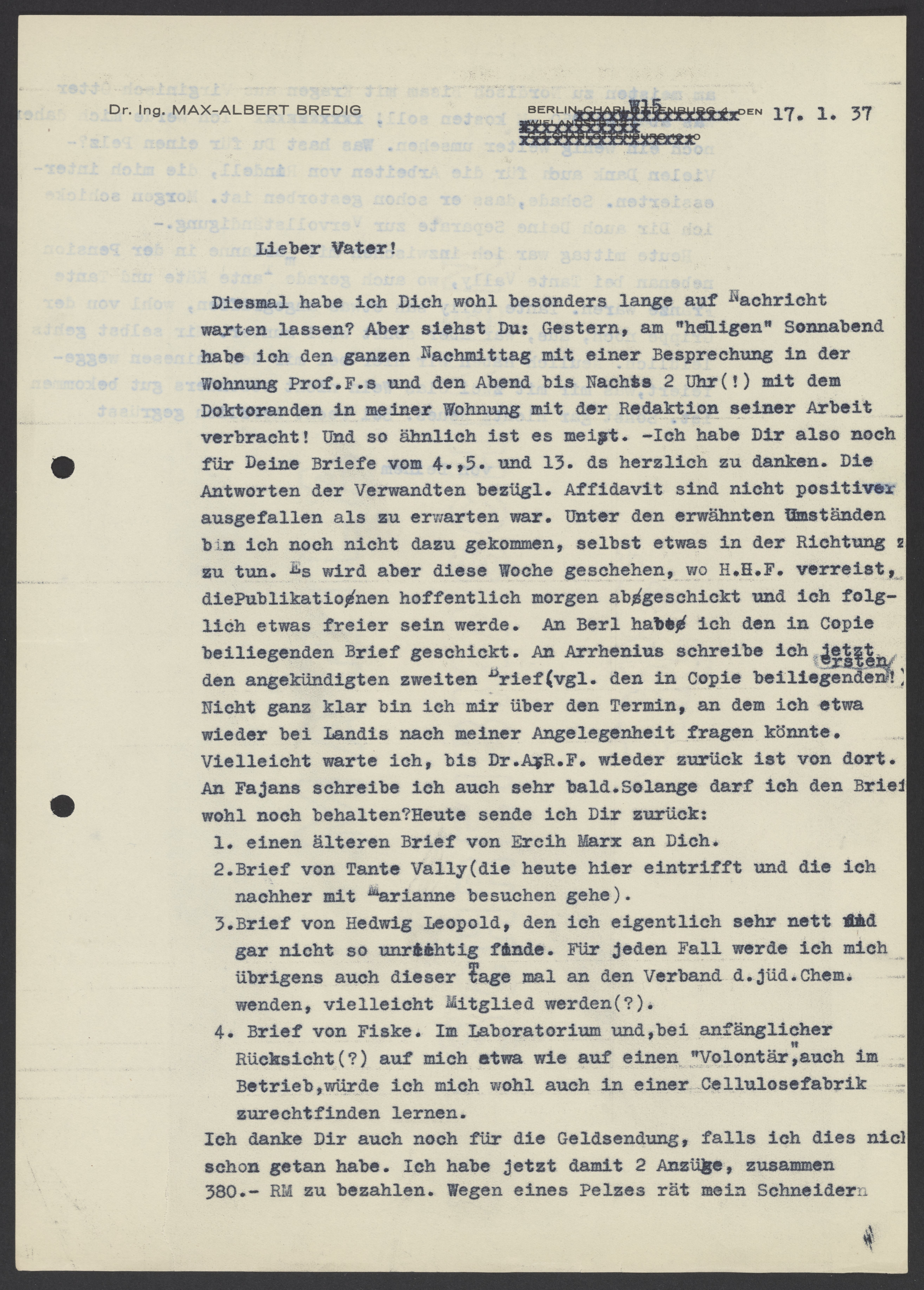 Letter from Max Bredig to Georg Bredig, January 17, 1937