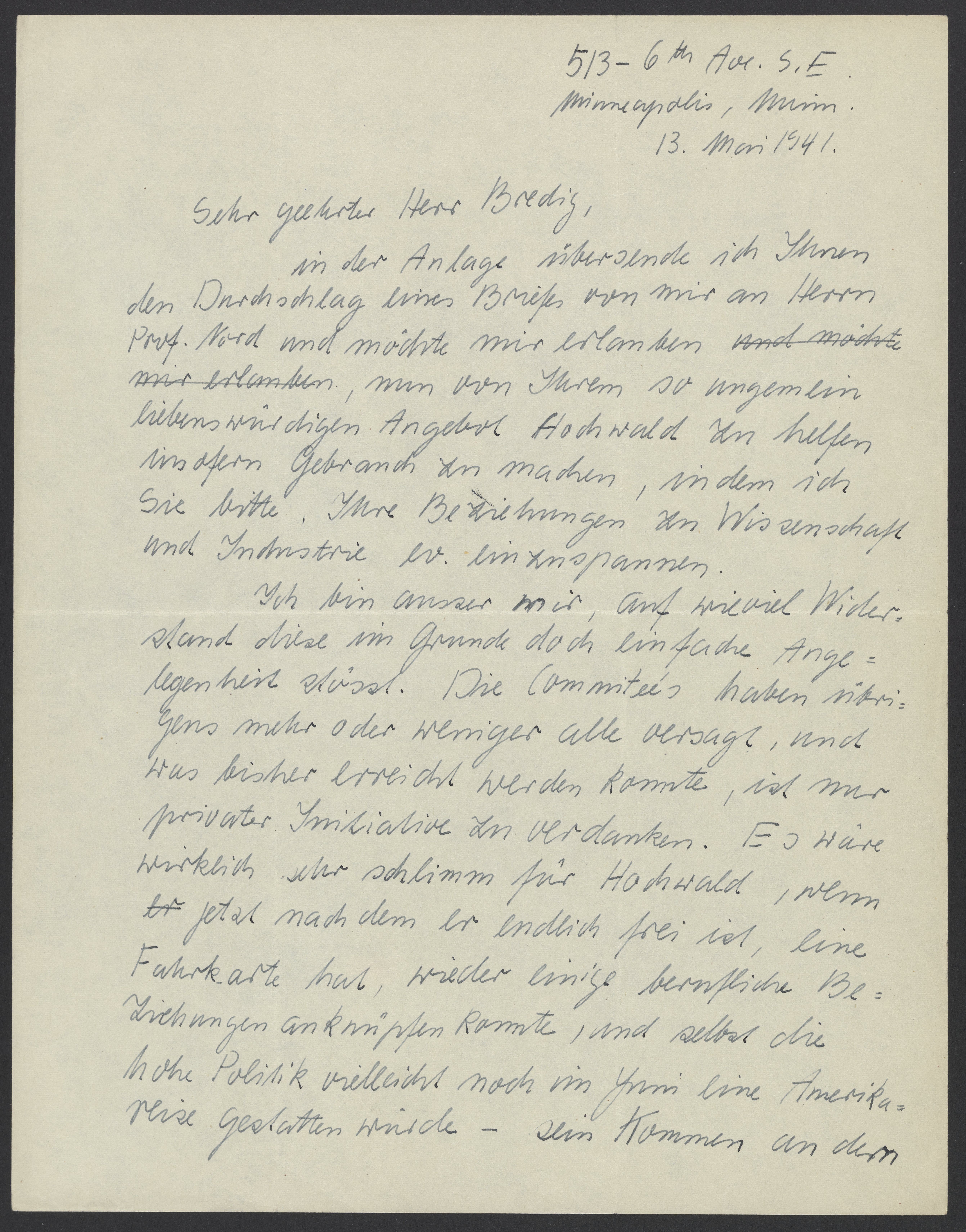 Letter from Ilse Wolfsberg to Max Bredig, May 13, 1941