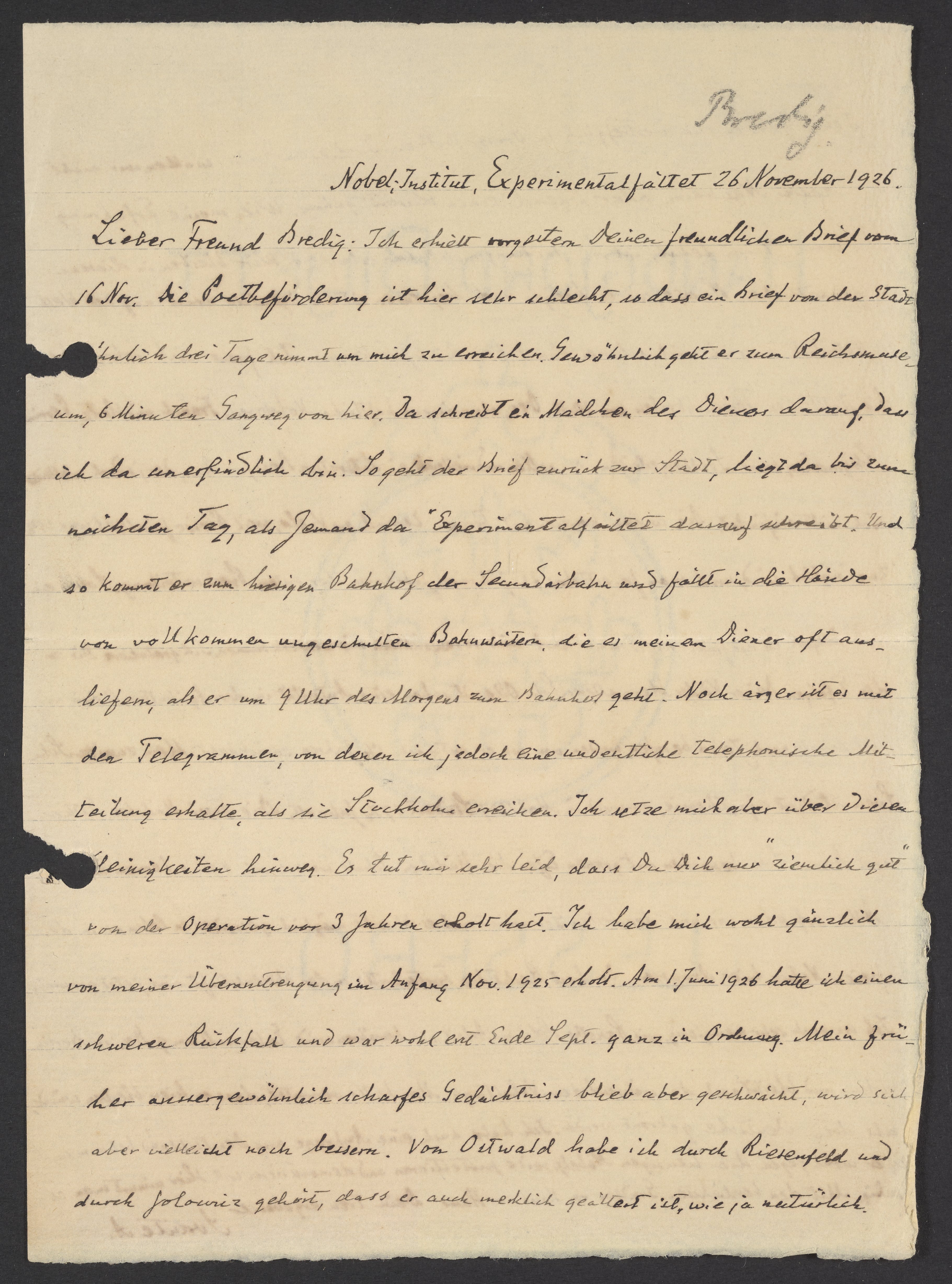 Lieber Freund Bredig: Ich erhielt vorgestern Deinen freundlichen Brief vom 16. Nov. Die Postbeförderung ist hier sehr schlecht, so dass ein Brief von der Stadt nämlich drei Tage nimmt an mich zu erreichen. Gewöhnlich geht er zum Reichsmade um, 6 Minuten ein Gangweg von hier. Da schreibt ein Mädchen des Dieners darauf, dass ich da unerfindlich bin. So geht der Brief zurück zur Stadt, liegt da bis zum nächsten Tag, als Jemand da „Experimentalfältet,“ darauf schreibt. Und so kommt er zum hiesigen Bahnhof der Sekundärbahn und fällt in die Hände von vollkommen ungescheiten Bahnwärtern, die es meinem Diener oft ausliefern, als er um 9 Uhr des Morgens zum Bahnhof geht. Noch ärger ist es mit den Telegrammen, von denen ich jedoch eine undeutliche telephonische Mitteilung erhalte, als sie Stockholm erreichen. Ich setze mich aber über diesen Kleinigkeiten hinweg. Es tut mir sehr leid, dass Du Dich nur „ziemlich gut“ von der Operation vor 3 Jahren erholt hast. Ich habe mich wohl gänzlich von meiner Überanstrengung im Anfang Nov. 1925 erholt. Am 1. Juni 1926 hatte ich einen schweren Rückfall und war wohl erst Ende Sept. ganz in Ordnung. Meine früher aussergewöhnlich scharfes Gedächtnis blieb aber geschwächt, wird sich aber vielleicht noch bessern. Von Ostwald habe ich durch Riesenfeld und durch Jolowicz gehört, dass er auch merklich geältert ist, wie ja natürlich.