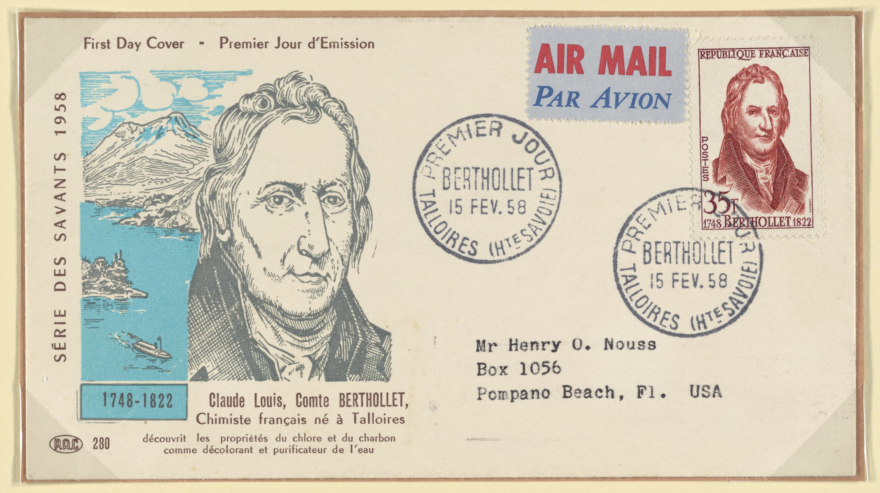 P.A.C. “First Day Cover Commemorating Claude-Louis Berthollet.” France, 1958. Witco Stamp Collection, Box 6. Science History Institute. Philadelphia. https://digital.sciencehistory.org/works/2n49t179j.