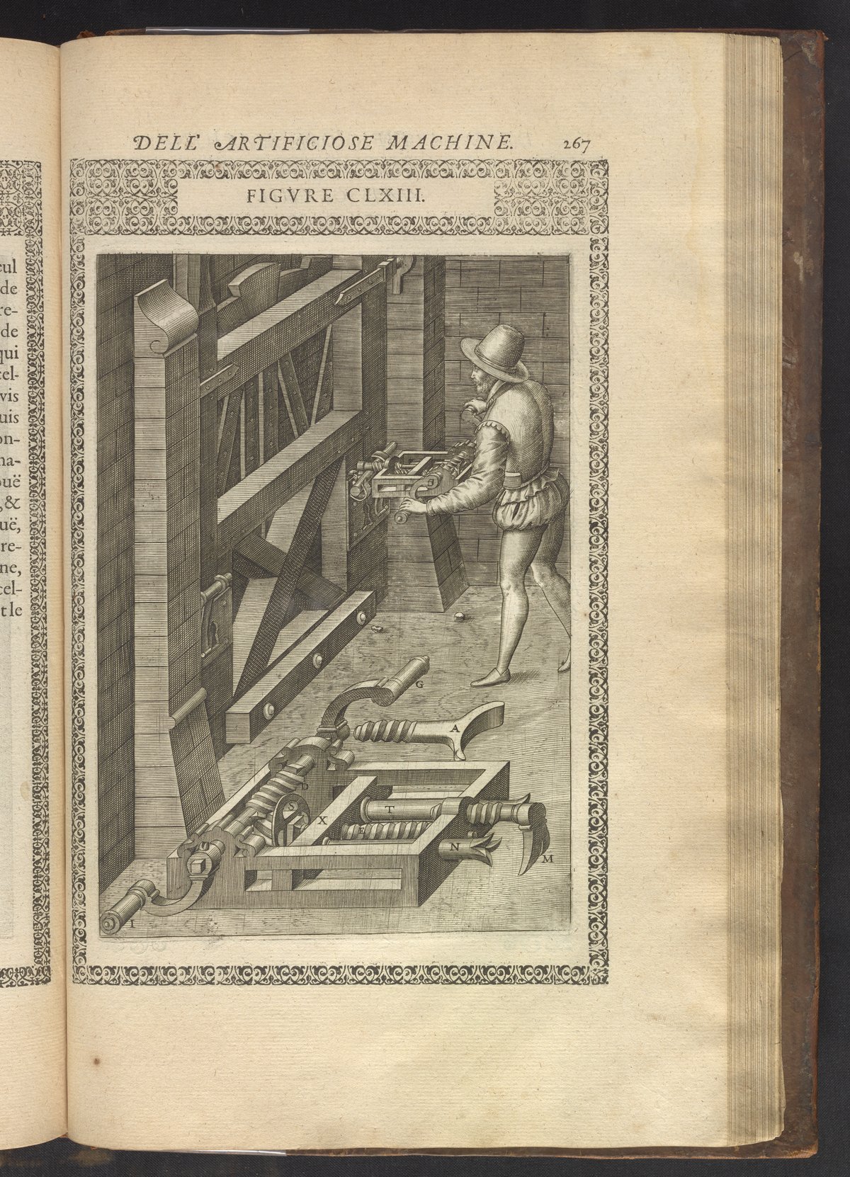 Ramelli, Agostino. “Plate 163: Screw-Jack for Breaking the Bolt off a Door.” In Le Diverse Et Artificiose Machine Del Capitano Agostino Ramelli. Paris, France, 1588. https://digital.sciencehistory.org/works/2n49t198r.