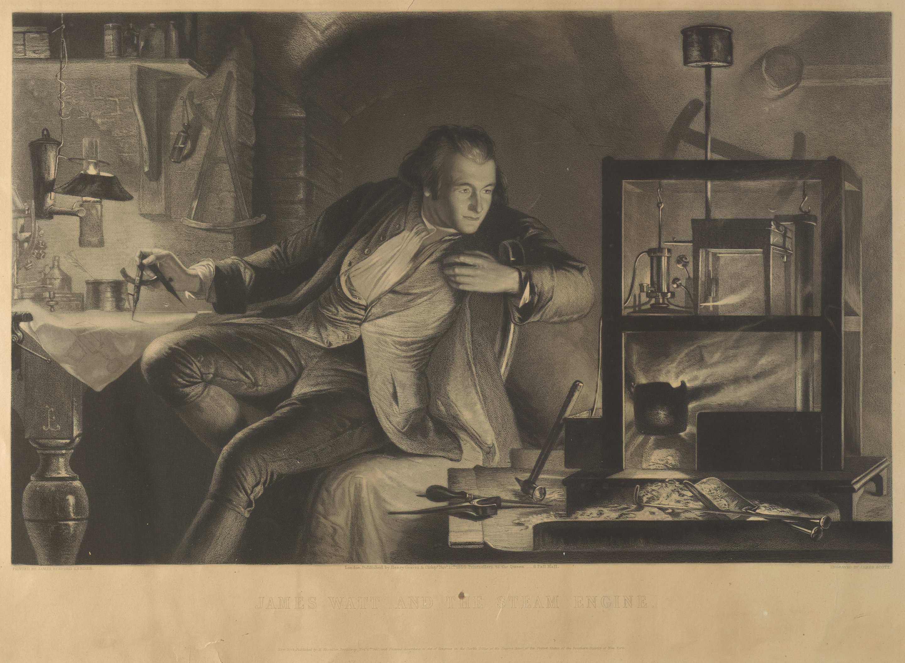 In this mezzotint print, James Watt sits in a small dark room, and he holds dividers on a table to the left of the composition. However, Watt has just turned in his chair to look over his shoulder at a pan of water issuing clouds of steam and working a piston set above it from the released pressure. An archway is behind the scene. The print is based on a famous painting by James Eckford Lauder at the Scottish National Gallery.
