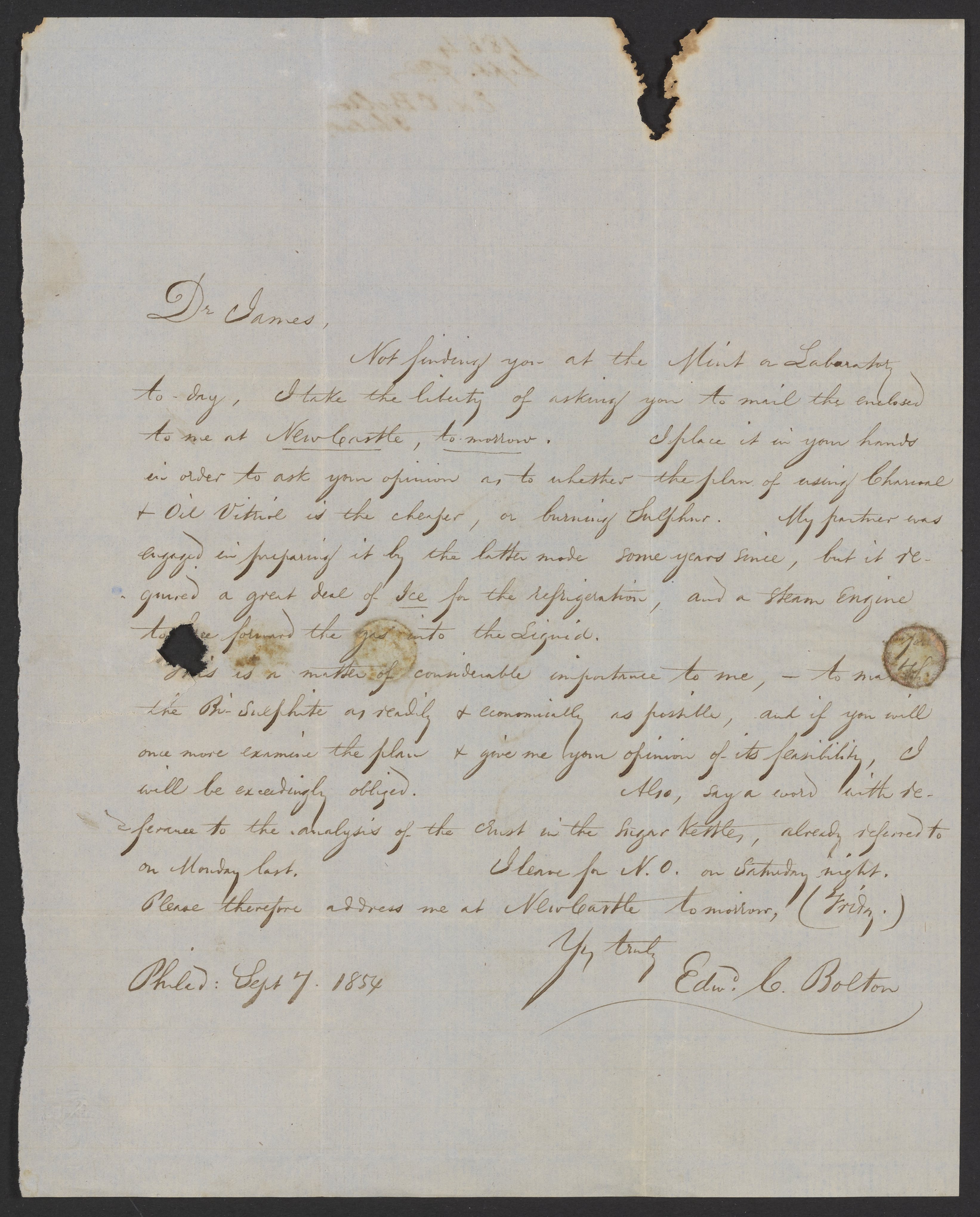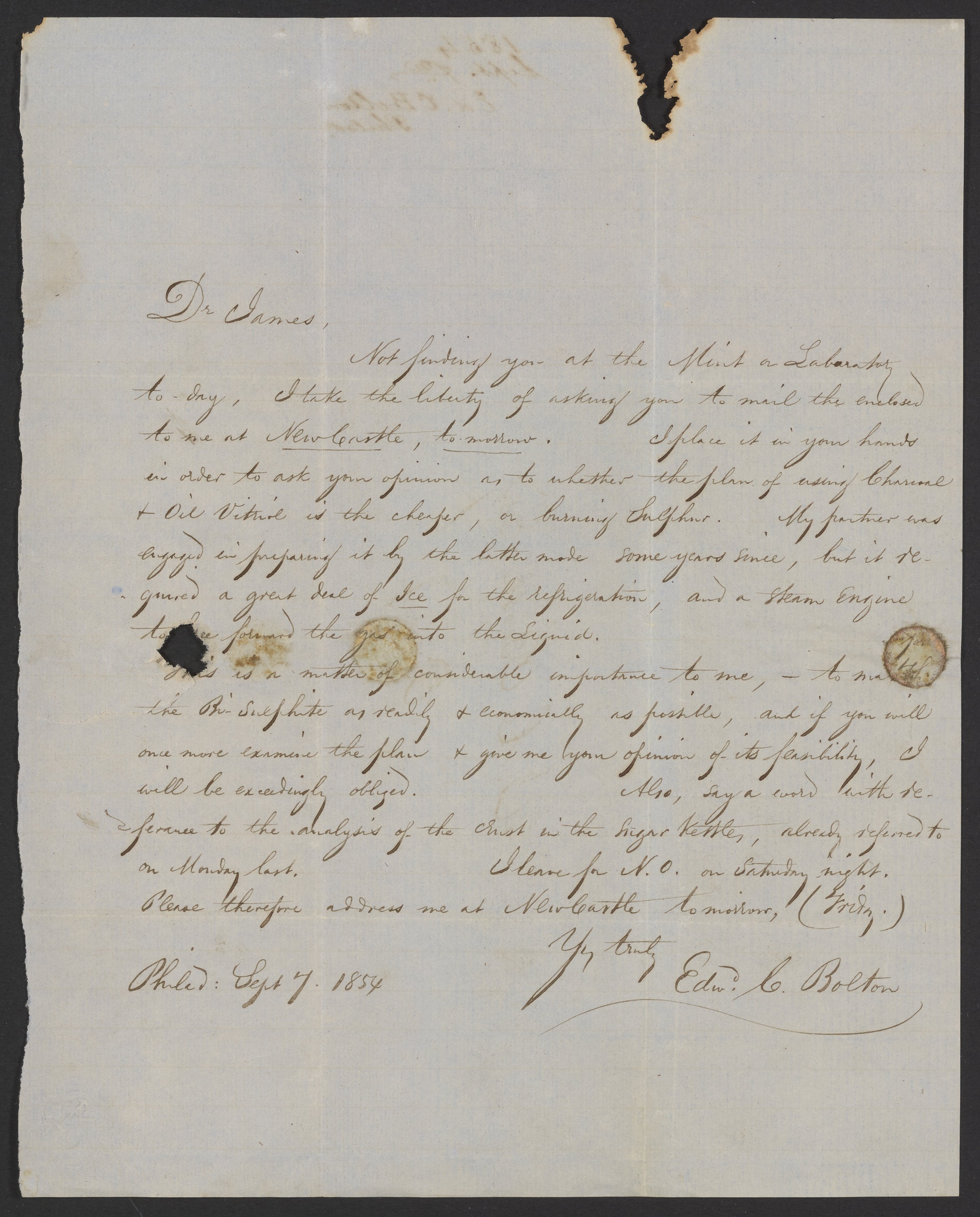 Bolton, Edward C. “Letter from E.C. Bolton to James Curtis Booth, September 7, 1854,” September 7, 1854. Papers of James Curtis Booth, Box 1, Folder 6. Science History Institute. Philadelphia. https://digital.sciencehistory.org/works/2o4z2xv.