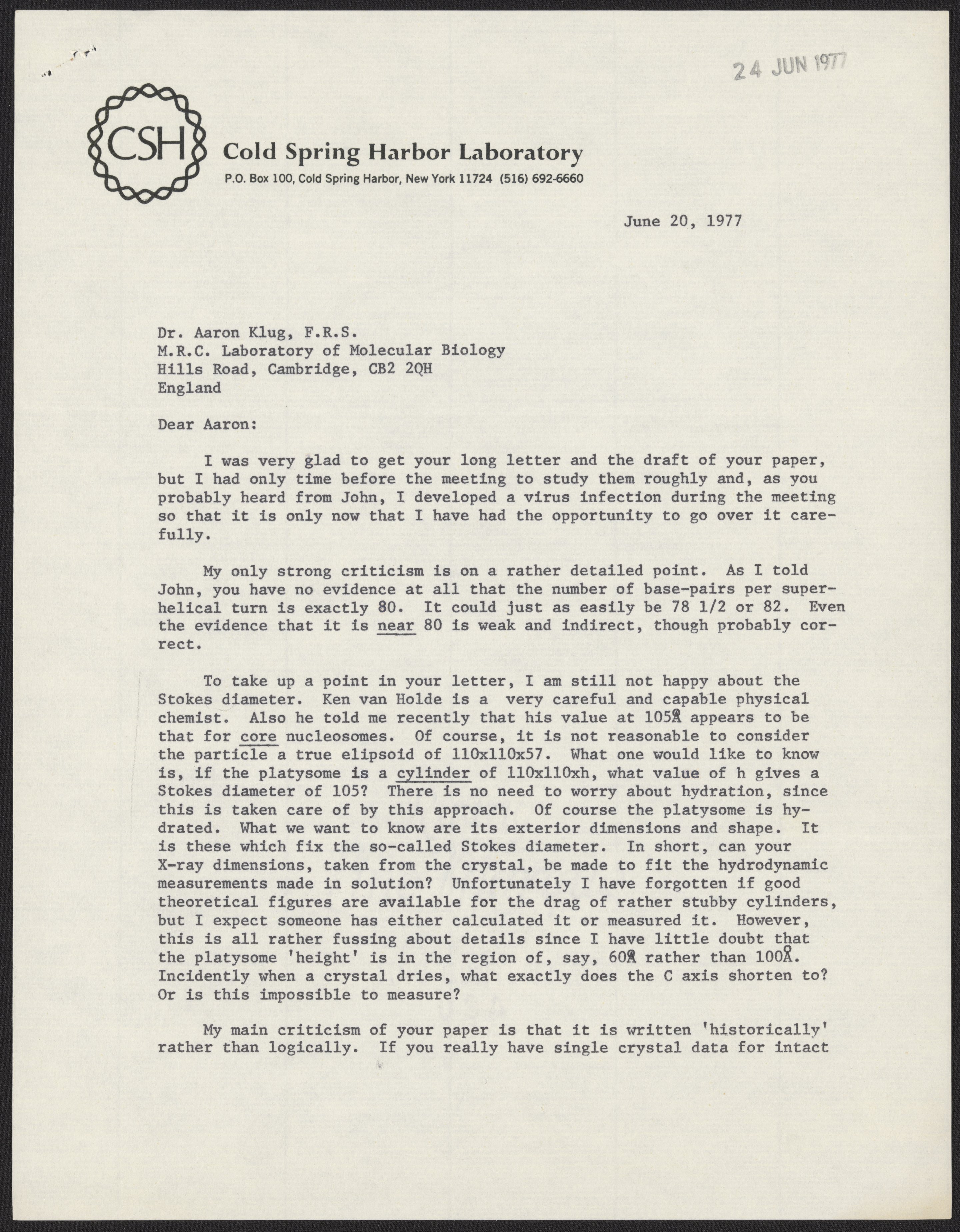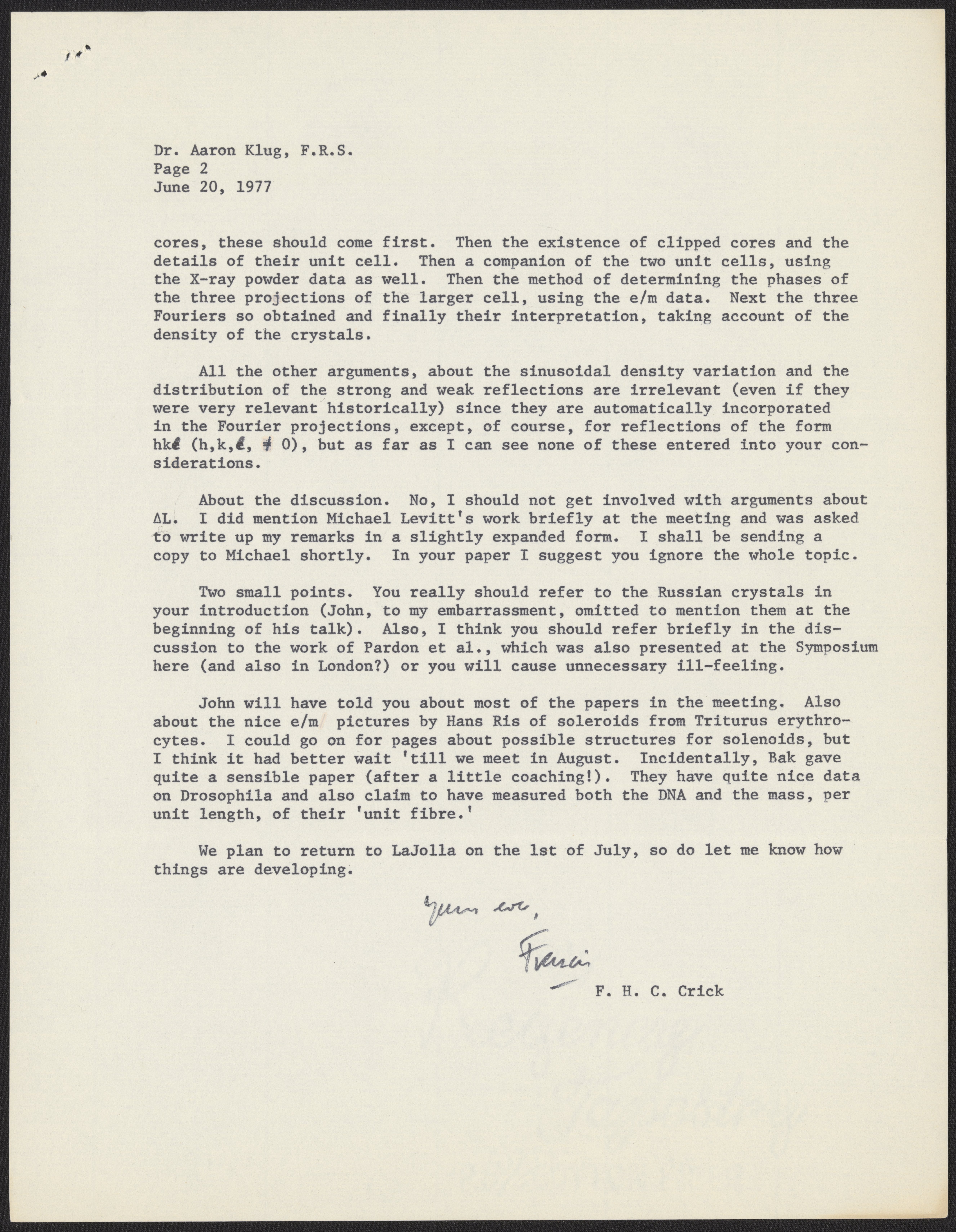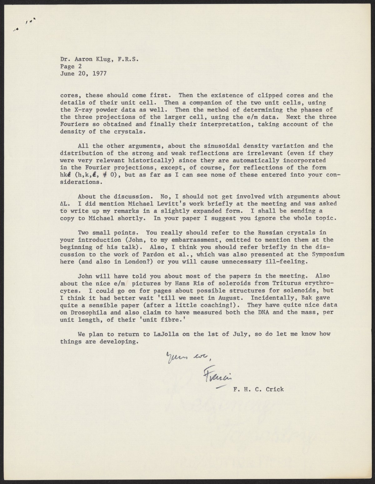 Letter from Francis Crick to Aaron Klug, June 20, 1977