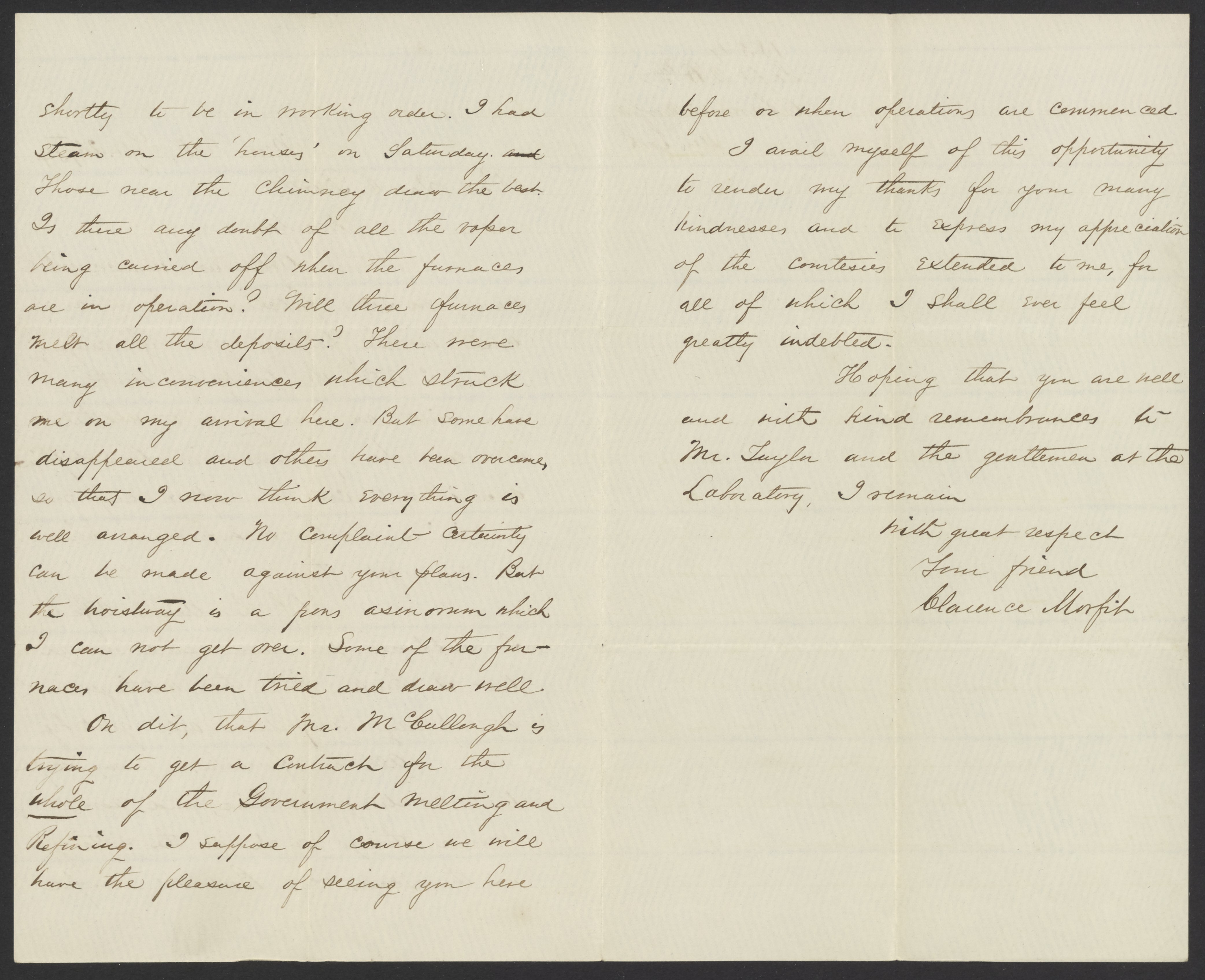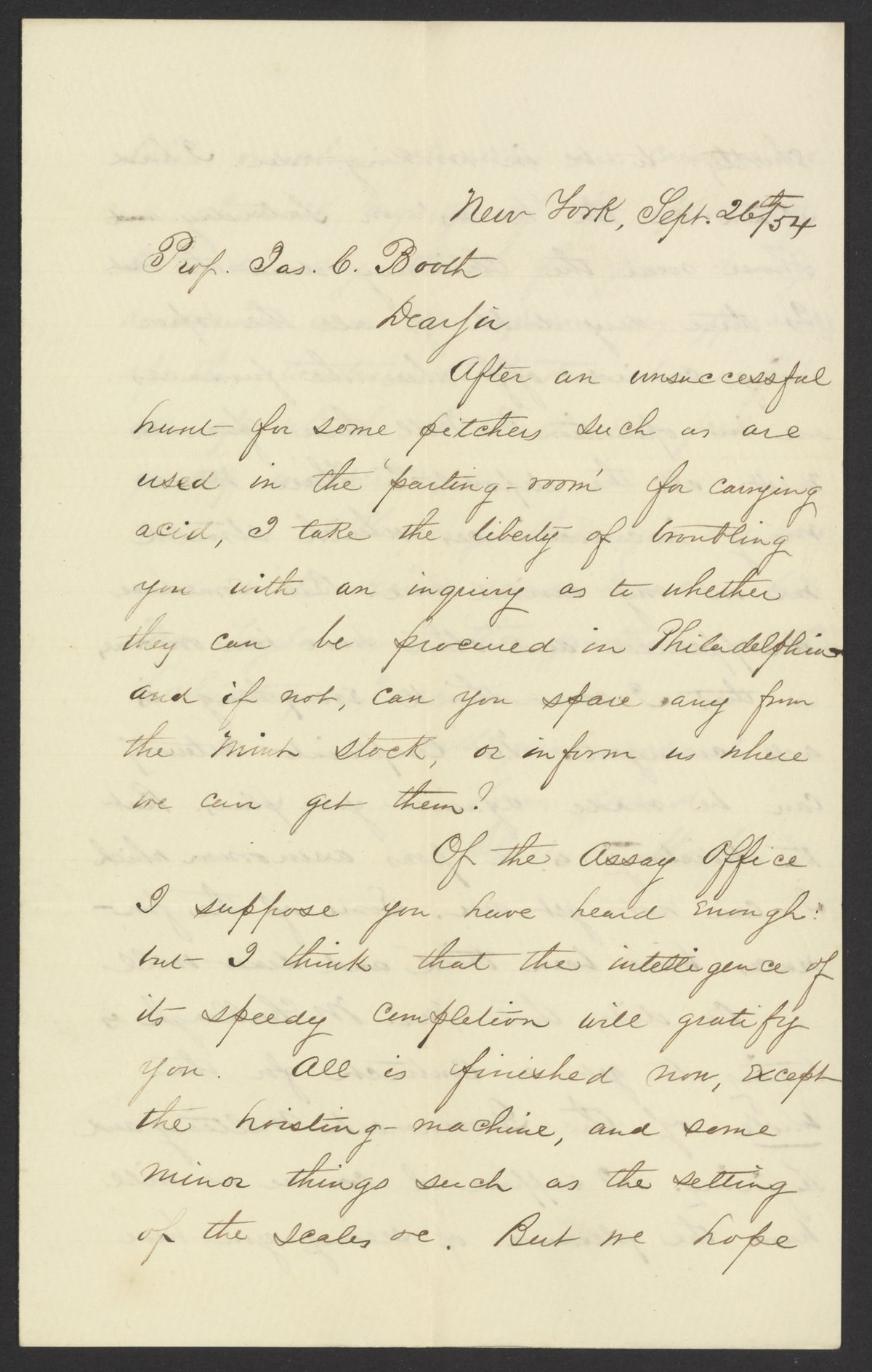 Morfit, Clarence. “Letter from Clarence Morfit to James Curtis Booth, September 26, 1854,” September 26, 1854. Papers of James Curtis Booth, Box 1, Folder 11. Science History Institute. Philadelphia. https://digital.sciencehistory.org/works/2q9isow.