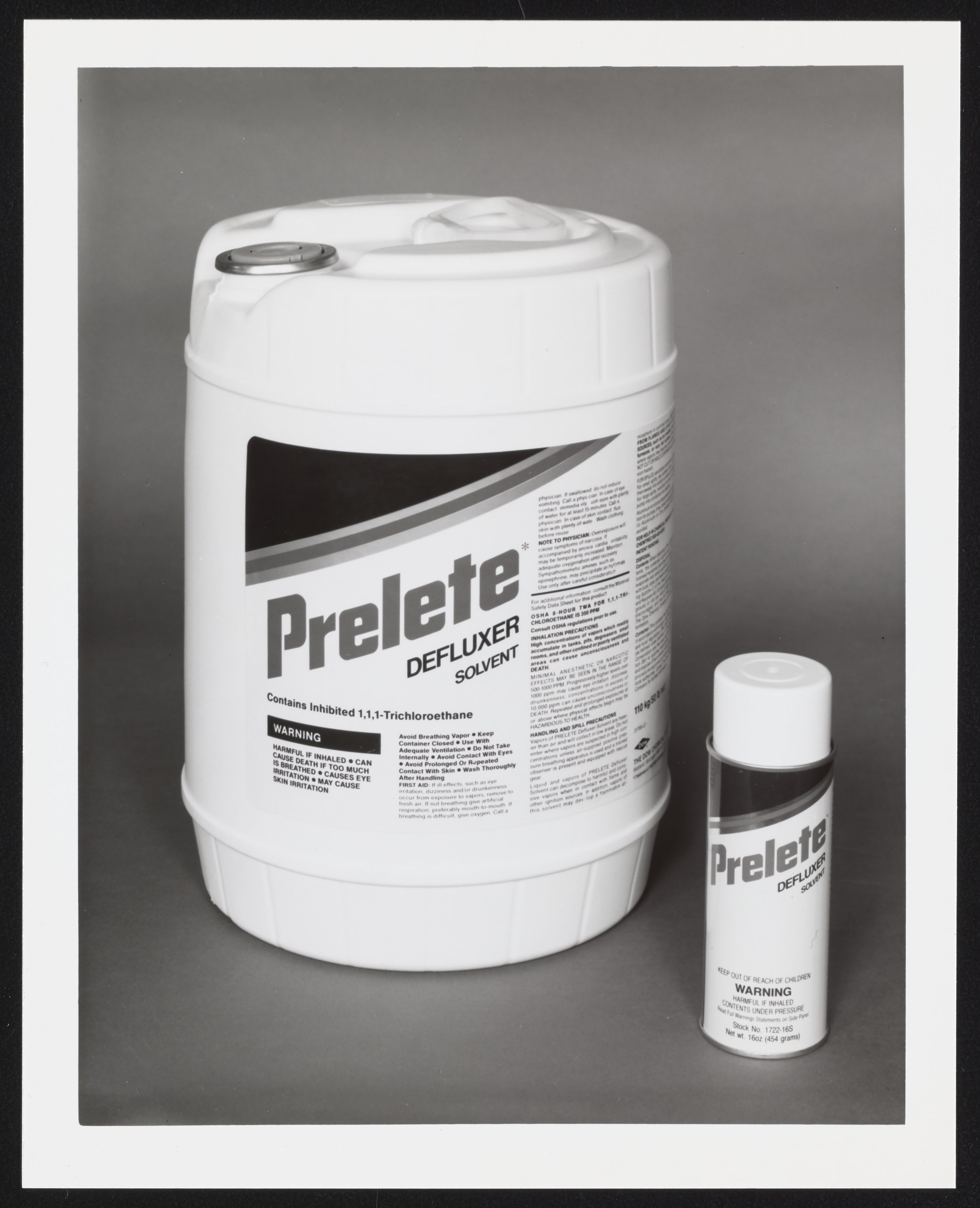 Promotional display advertising Prelete, a chemical solvent used to remove fluxes from circuit boards and other electronic components.