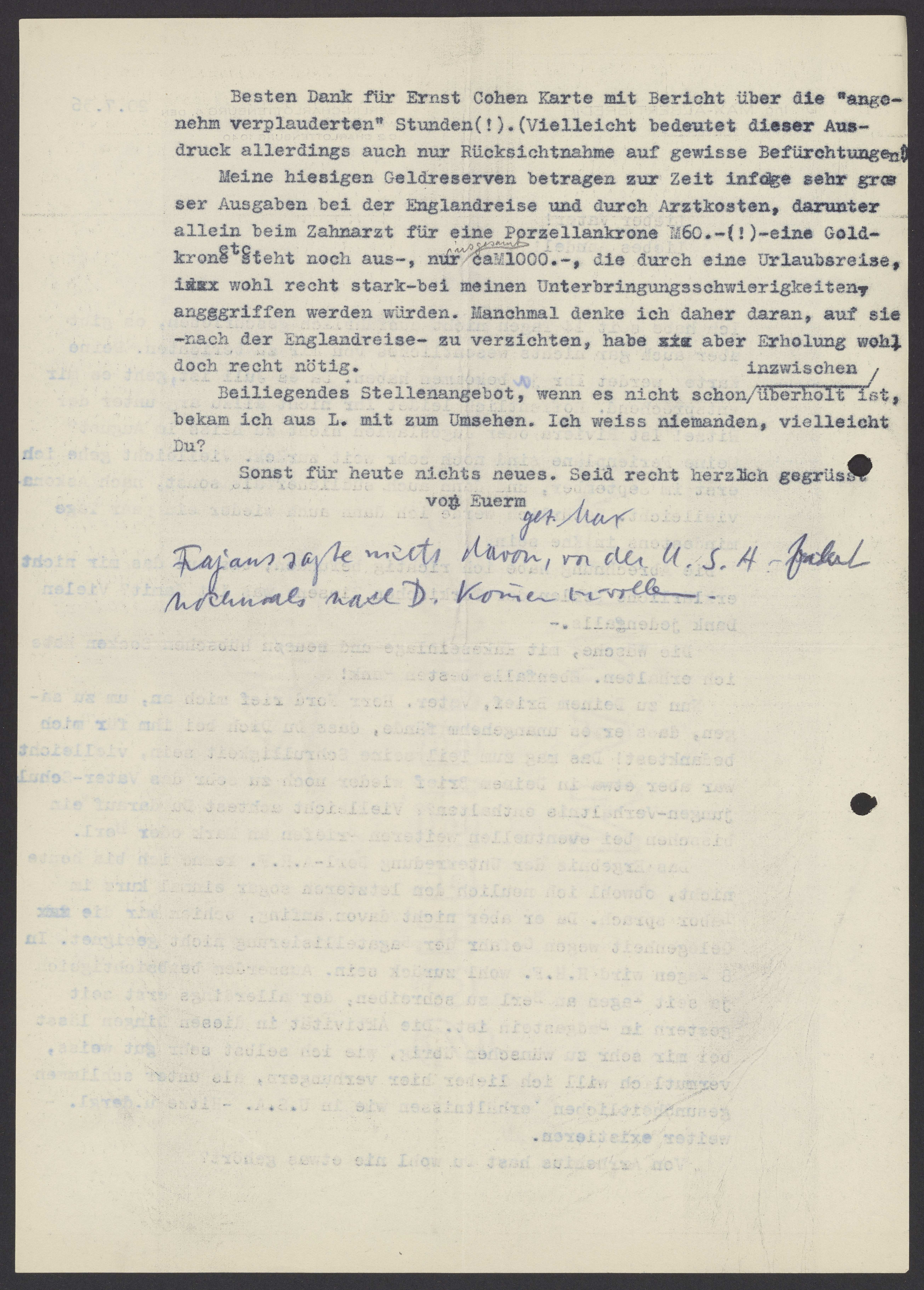 Meine hiesigen Geldreserven betragen zur Zeit infolge sehr grosser Ausgaben bei der Englandreise und durch Arztkosten, darunter allein beim Zahnarzt für eine Porzellankrone M60.-(!) – eine Goldkrone etc seht noch aus –, nur caM1000.-, die durch eine Urlaubsreise, wohl recht stark – bei meinen Unterbringungsschwierigkeiten, angegrifen werden würden. Manchmal denke ich daher daran, auf sie – nach der Englandreise – zu verzichten, habe aber Erholung wohl, doch recht nötig.