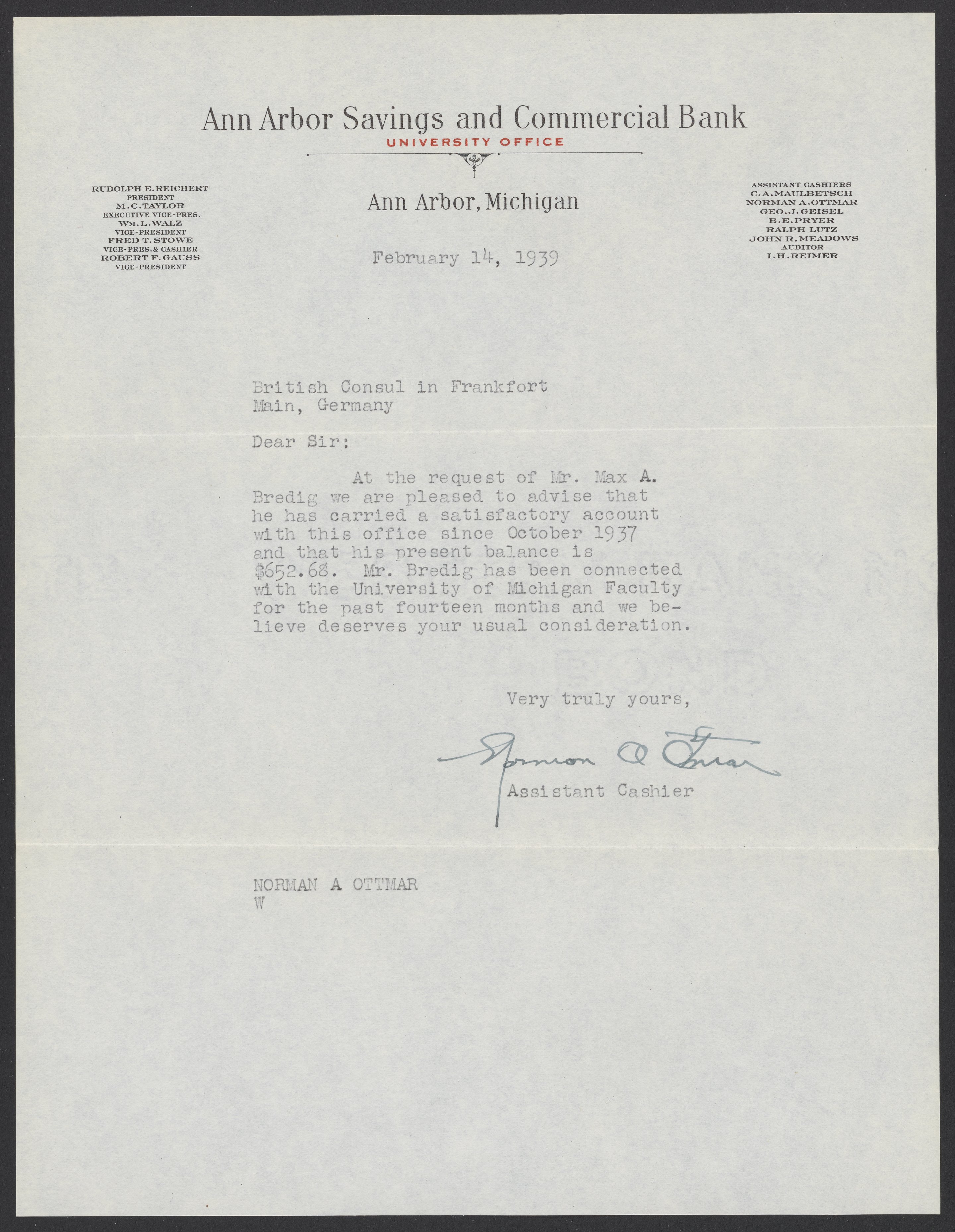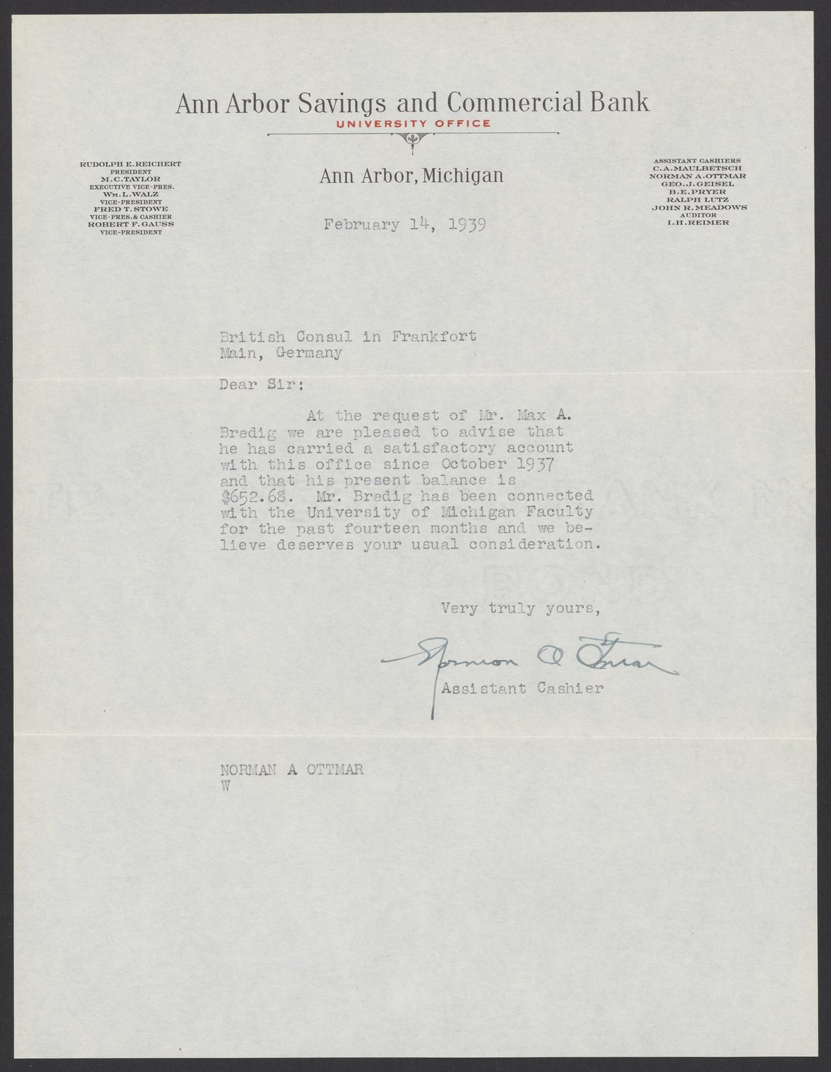 Letter from Norman A. Ottmar to the British Consul in Frankfort Main, Germany