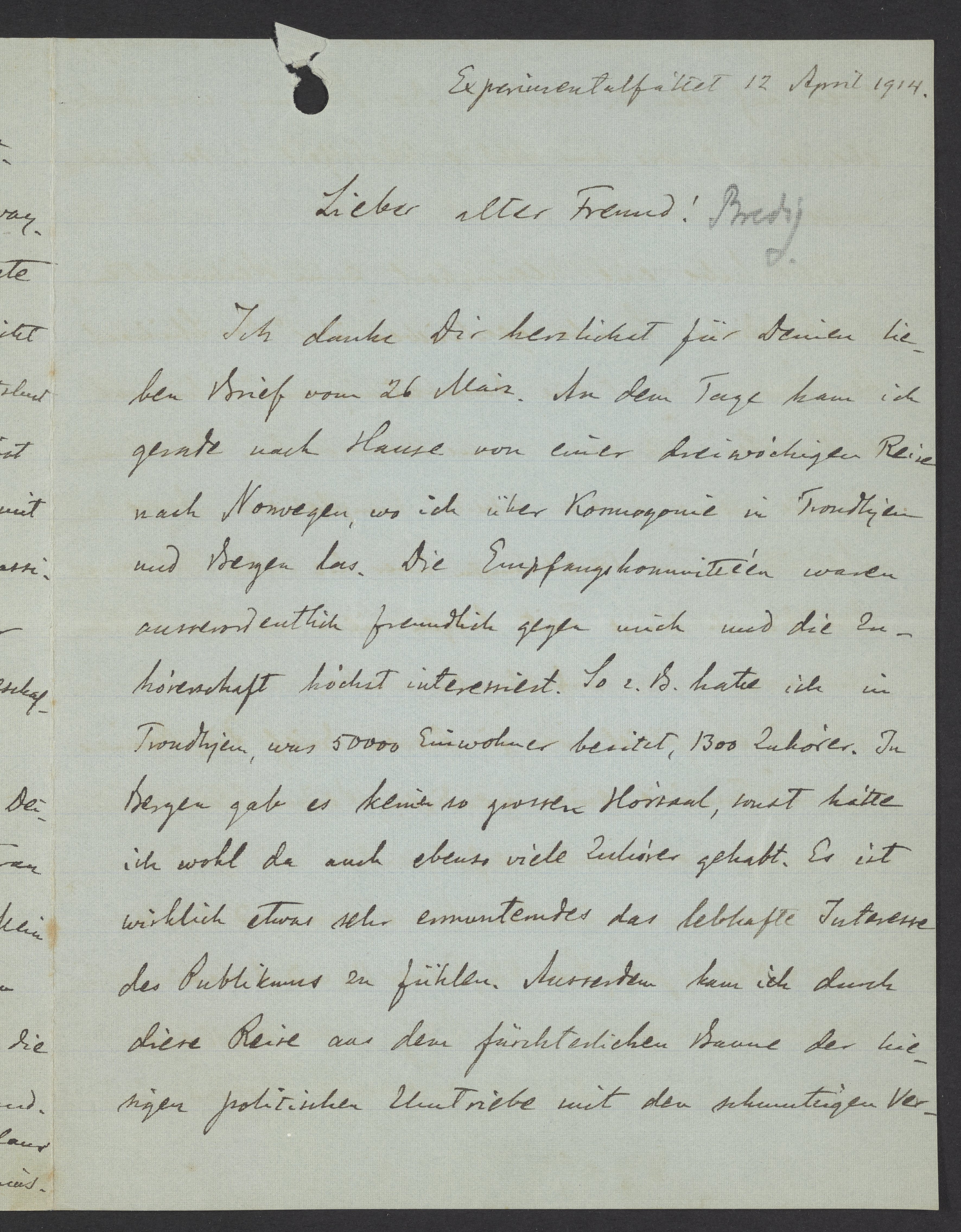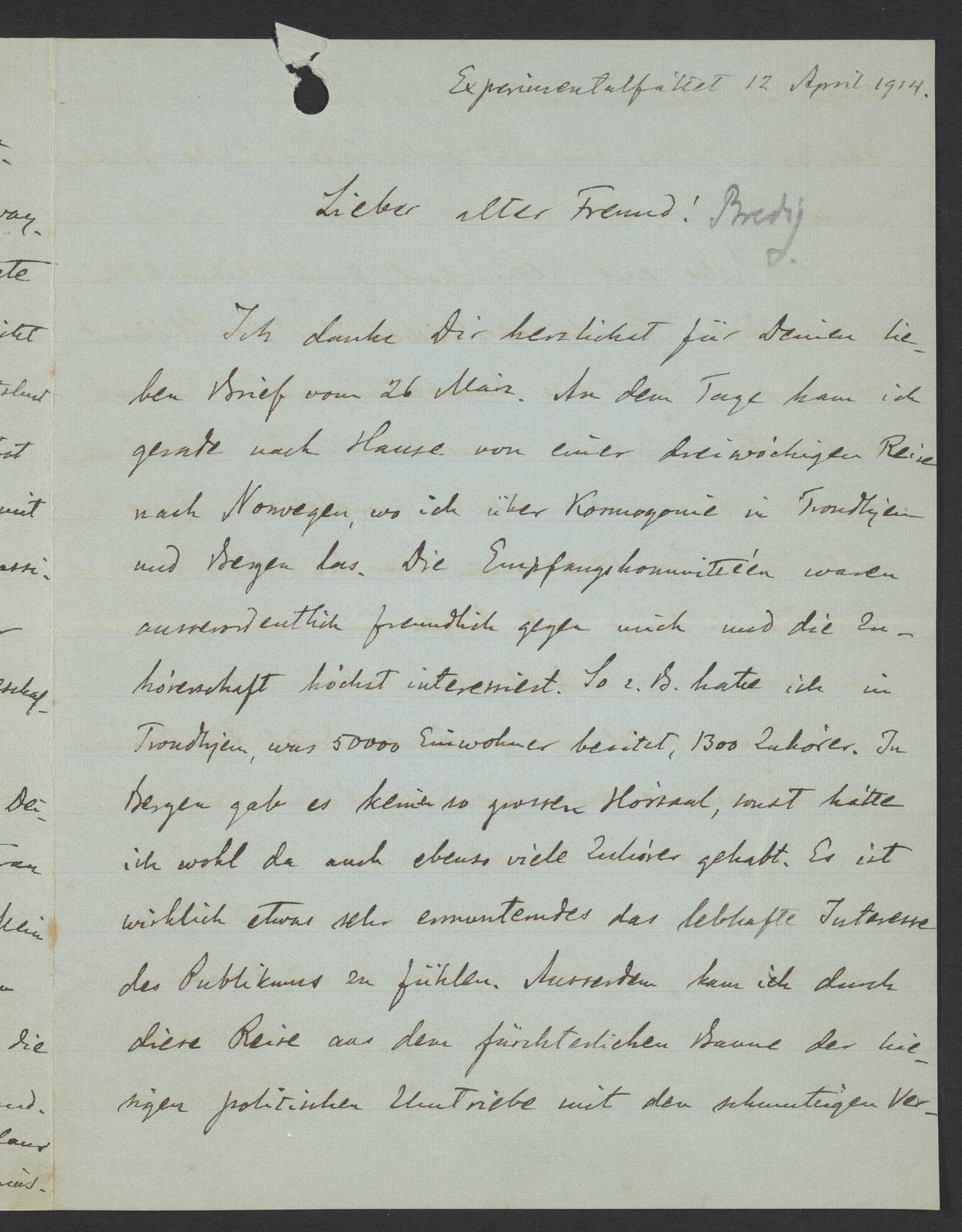 Letter from Svante Arrhenius to Georg Bredig, April 1914