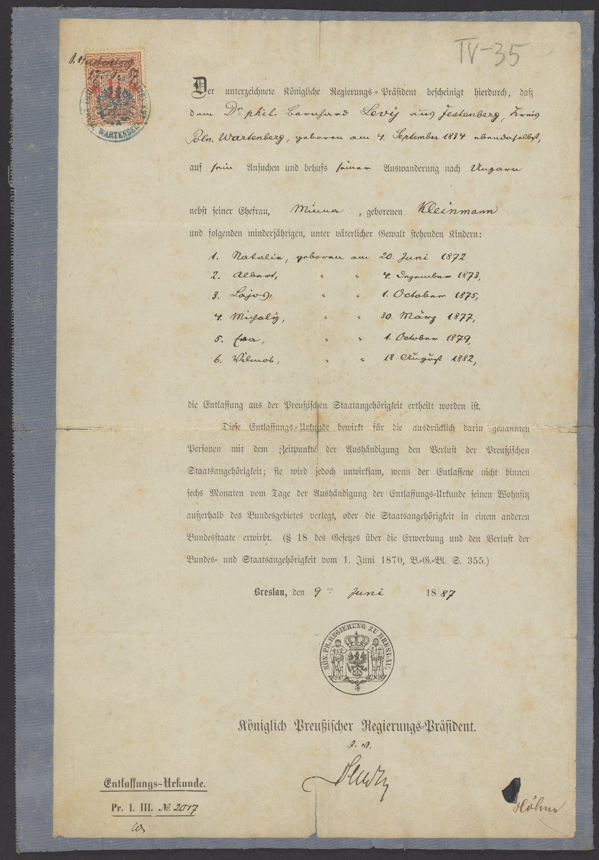 Certificate releasing Levy family members from Prussian citizenship, 1887