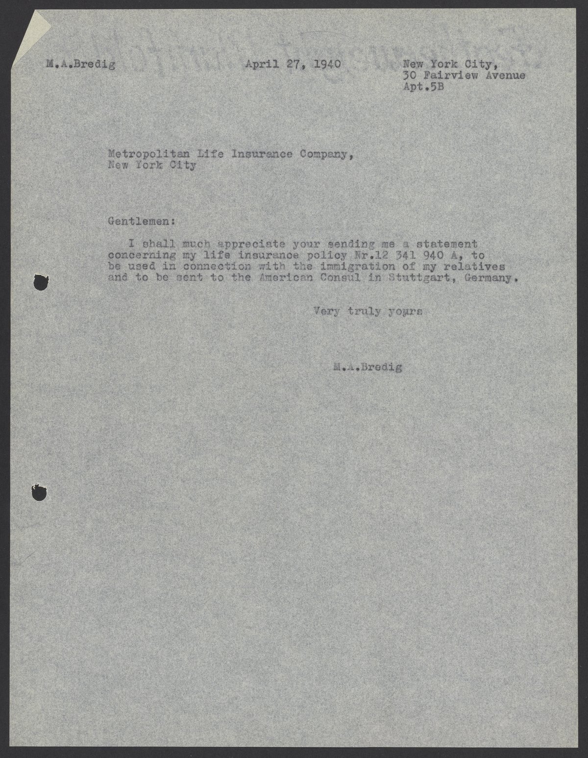Letter from Max Bredig to Metropolitan Life Insurance Company, April 27, 1940