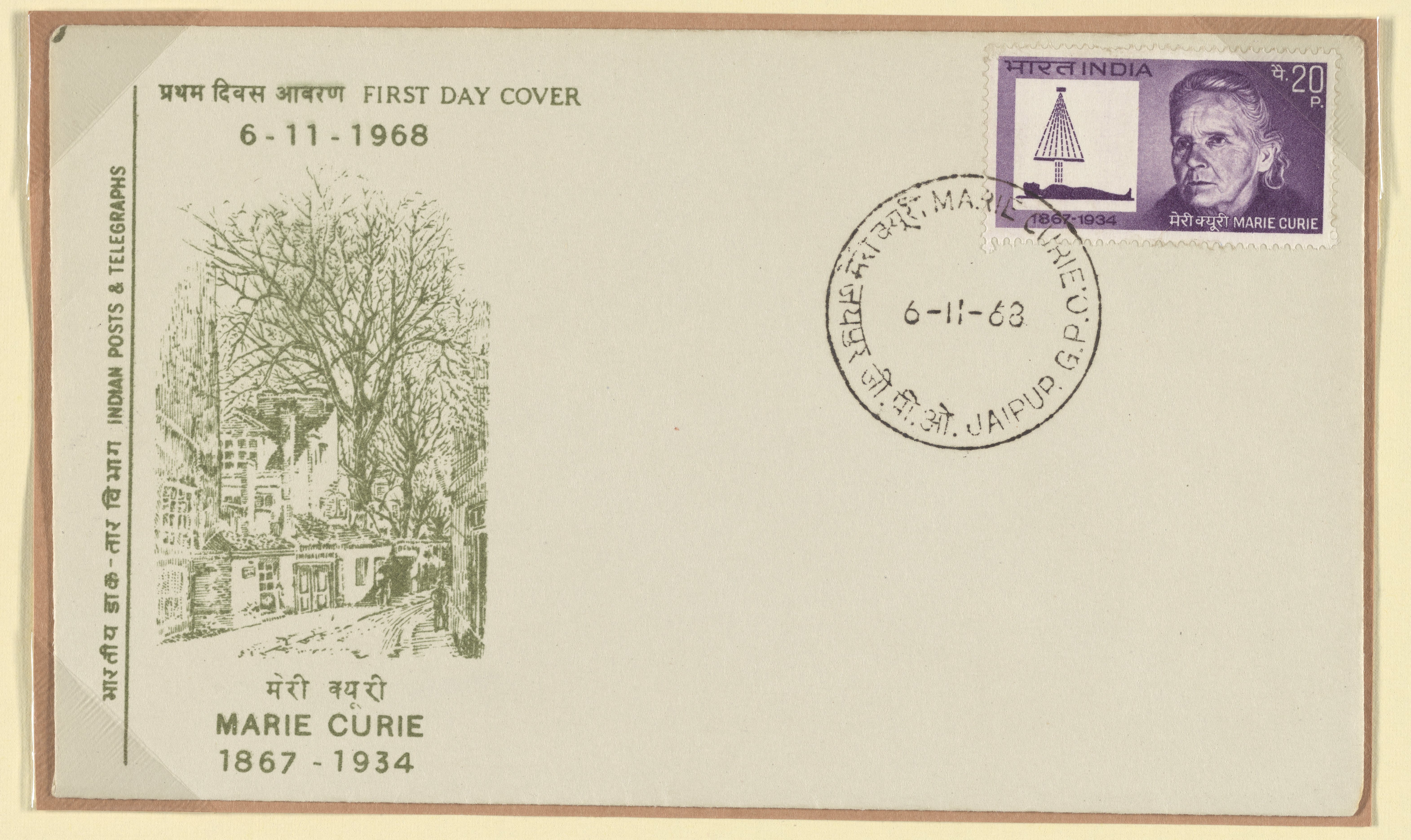 “First Day Cover Commemorating the 100th Anniversary of the Birth of Marie Curie.” India: India Security Press, November 6, 1968. Witco Stamp Collection, Box 2. Science History Institute. Philadelphia. https://digital.sciencehistory.org/works/2v23vt40n.
