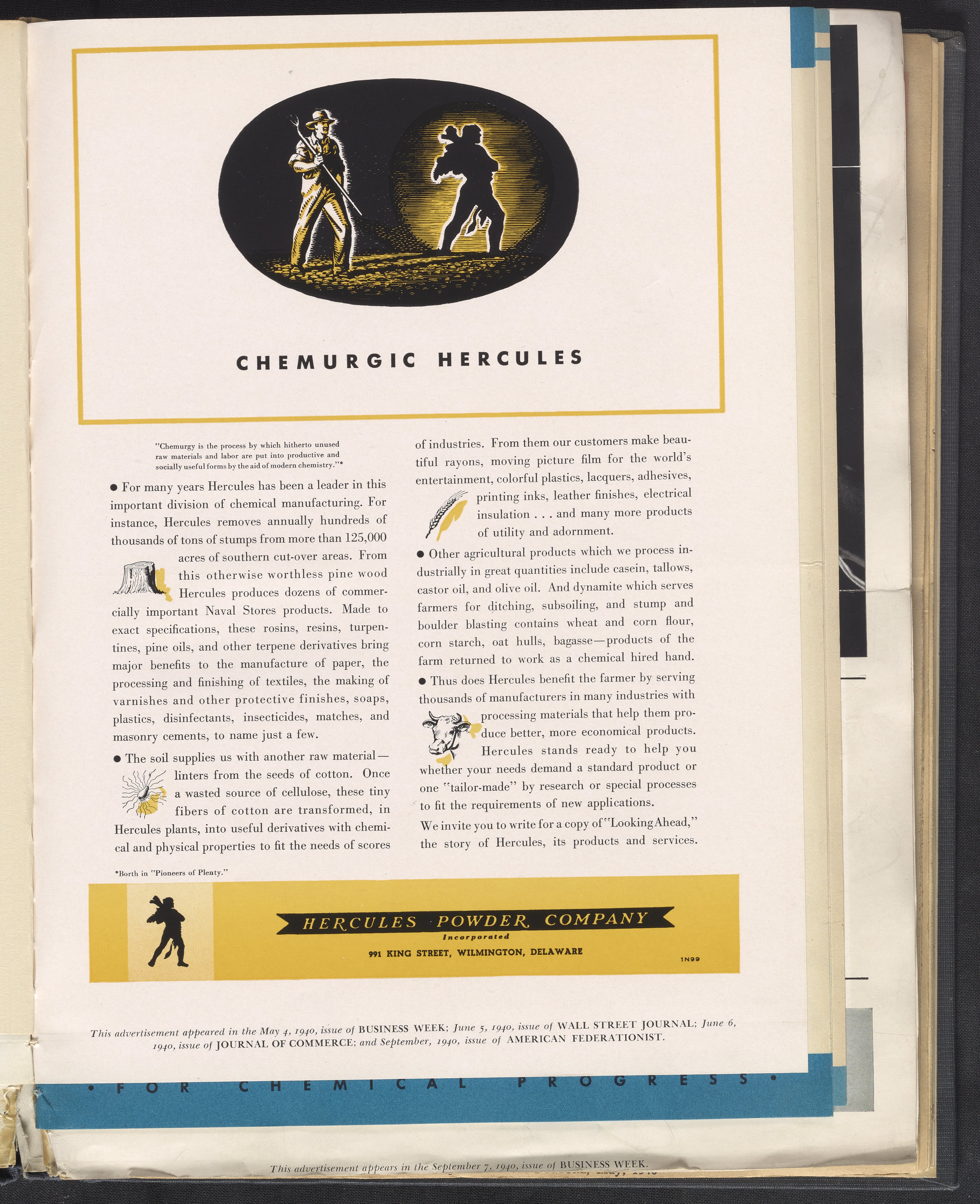 Hercules Incorporated. “Chemurgic Hercules.” 1940 Hercules Advertisements, 1940. Records of Hercules Incorporated, Volume 1940. Science History Institute. Philadelphia. https://digital.sciencehistory.org/works/2v23vv261.