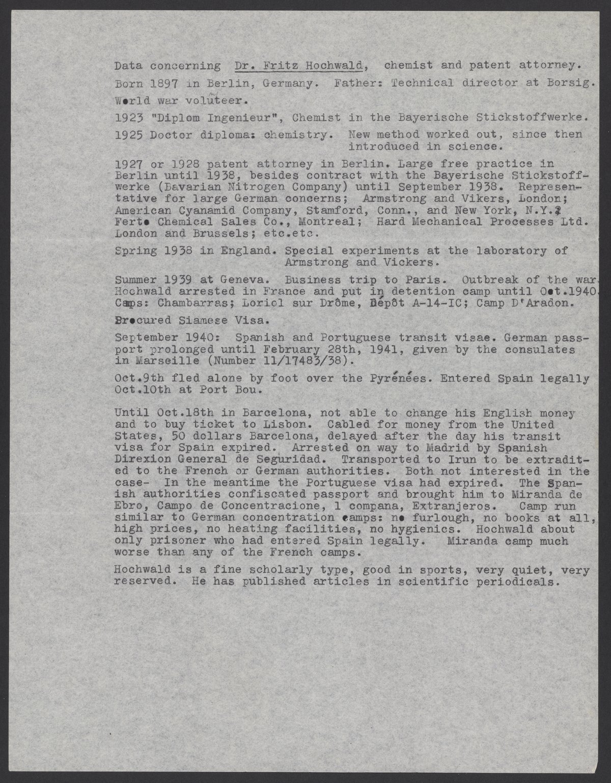 Data concerning Dr. Fritz Hochwald, Chemist and Patent Attorney
