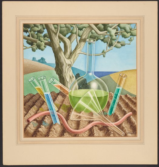 A landscape in watercolor, featuring a farm scene with a large tree that spreads its branches across the top of the image. At bottom, a planted field in rows. Superimposed on the landscape is a large glass bottle, a glass funnel, and a quartet of test tubes, filled with clear green and blue liquids. The image celebrates the advances in farm chemistry and agricultural science during the first half of the twentieth century.