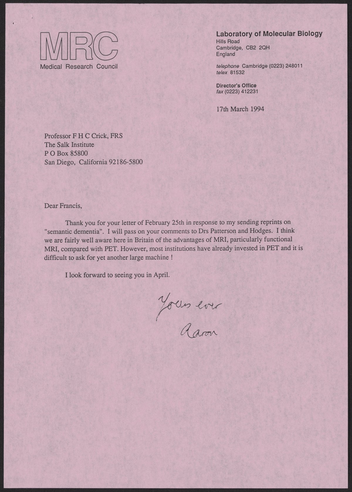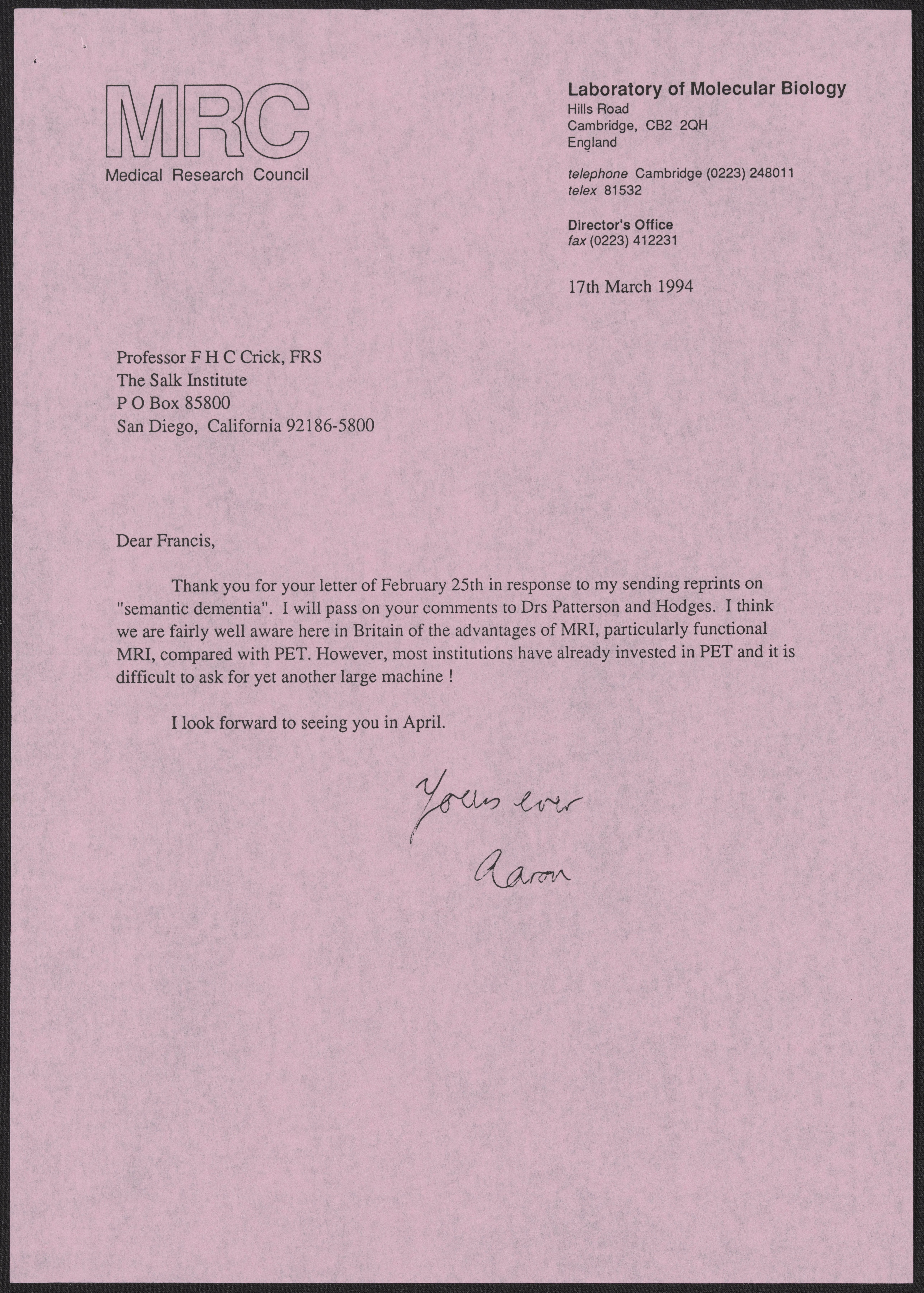 Klug, A. (Aaron), Sir. “Letter from Aaron Klug to Francis Crick, March 17, 1994,” July 17, 1994. History of Molecular Biology Collection, Box 20, Folder 5. Science History Institute. Philadelphia. https://digital.sciencehistory.org/works/2yaddwq.