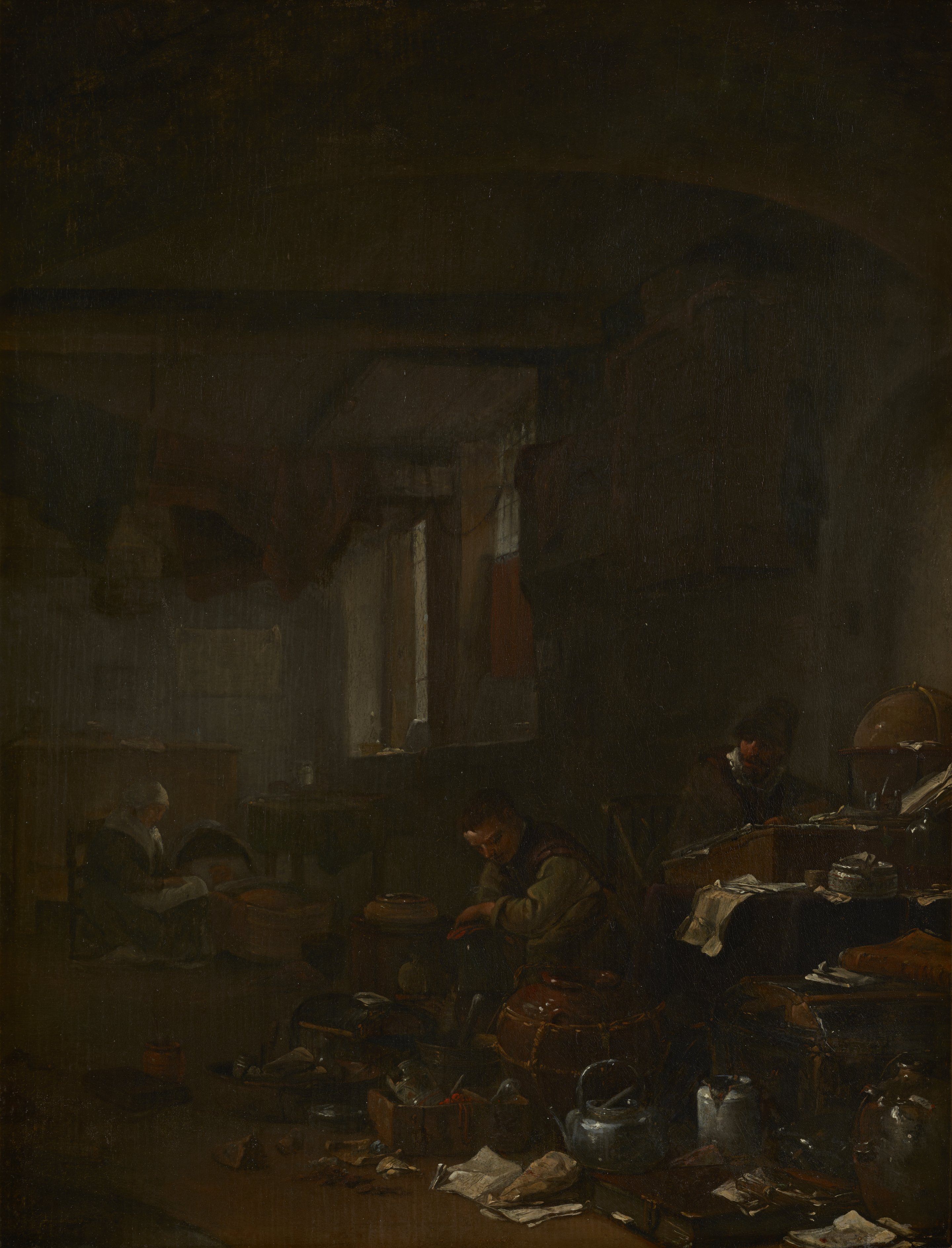 An alchemist seated at his desk glances down at his assistant, who works on the floor beside him. A globe and lectern indicate his scholarly studies. Large earthenware jars, jugs, and other vessels sit piled high beside the desk, along with texts and papers. In the far background, a mother sits beside a cradle in the luminous and gentle glow of an open window.