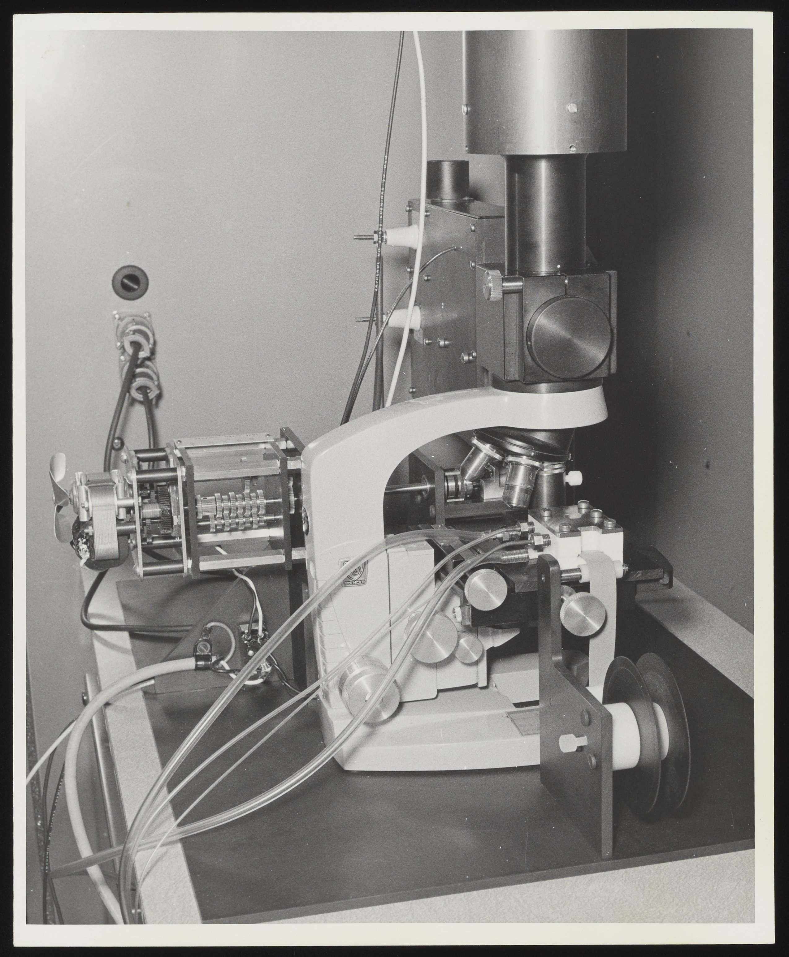 Beckman's Space Engineering Group (SEG) was formed within the Scientific Process Instruments Division (SPID) in 1959. In 1964, it subcontracted to Space General Corp. to perform work for the U.S. Army. The SEG was tasked with exploring new techniques for detecting bacteriological warfare agents (like this microspectrophotometer) and developing a device using the fluorescent antibody staining technique (FAST).