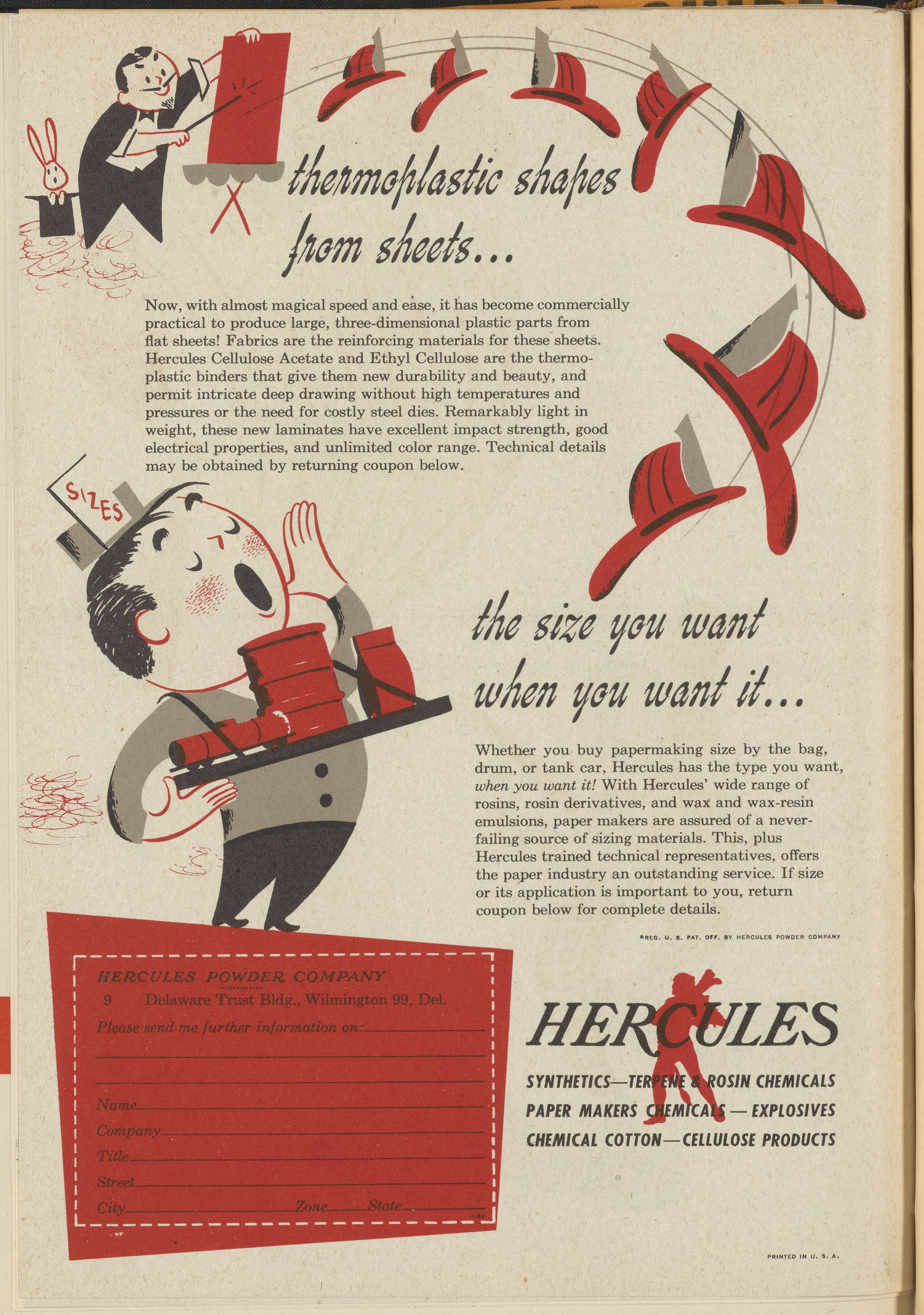 Hercules Incorporated. “Cues and Clues for Improved Products and Processes.” 1946 Hercules Advertisements, 1946. Records of Hercules Incorporated, Volume 1946. Science History Institute. Philadelphia. https://digital.sciencehistory.org/works/2z3ht7h.