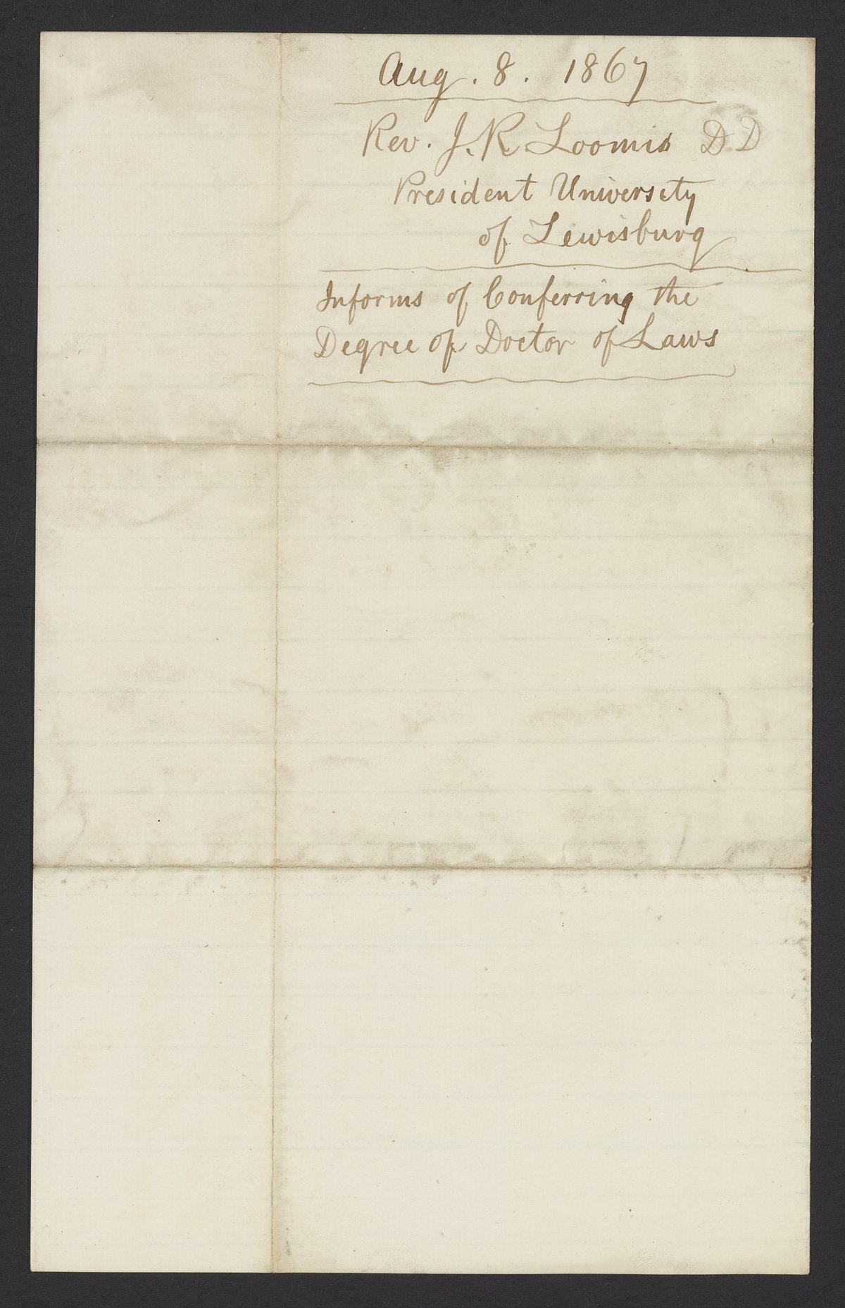 Small JPG1200 x 1850px — 283 KBFull-sized JPG2214 x 3414px — 799 KBOriginal fileTIFF — 2214 x 3414px — 21.7 MBJustin Rolph Loomis (1810-1898), president of the University of Lewisburg (now Bucknell University), writes to confer a Doctor of Law degree upon James Curtis Booth (1810-1888).